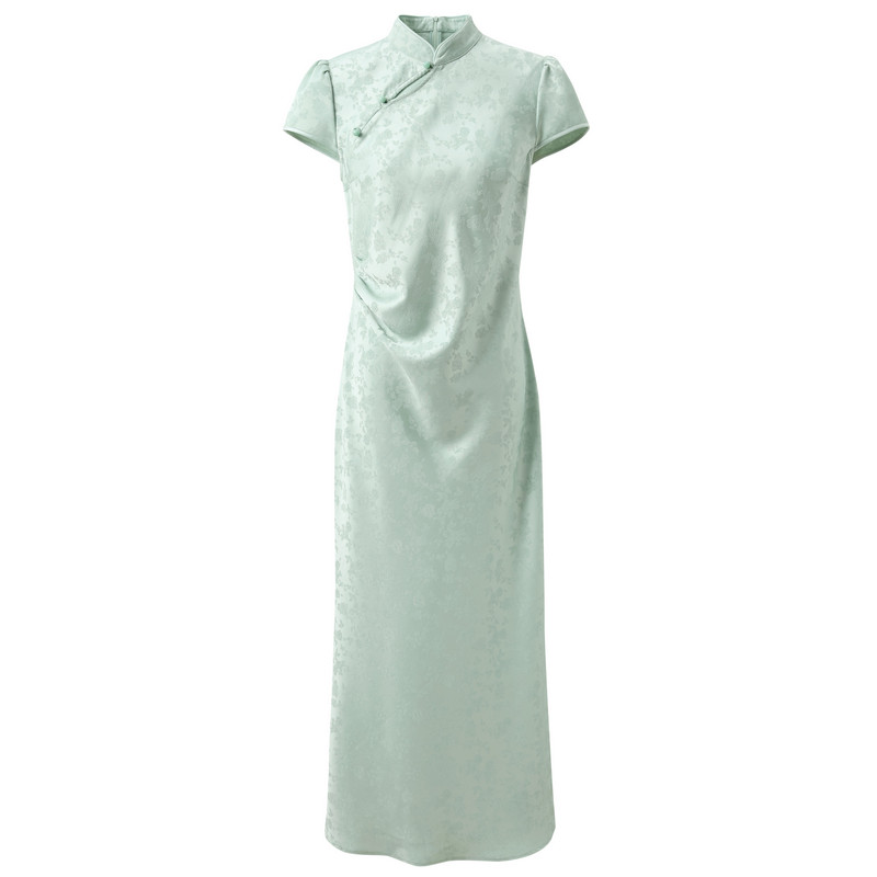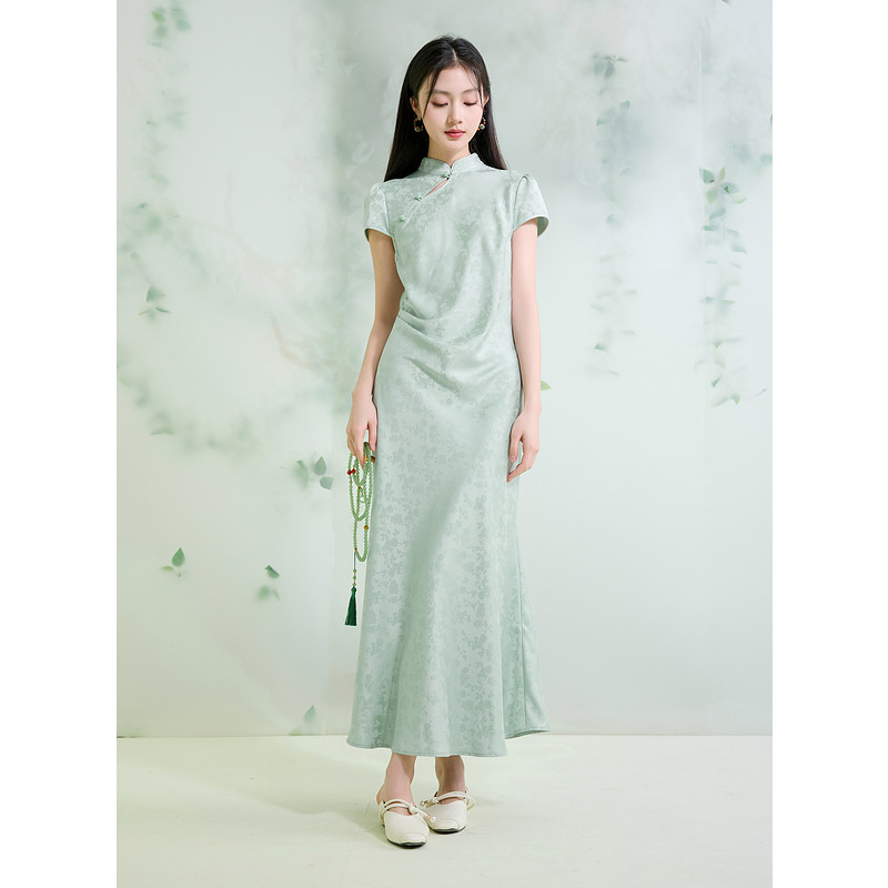 📚 三彩【浅玉流光】2025夏季新款新中式玫瑰缎面连衣裙改良旗袍裙C