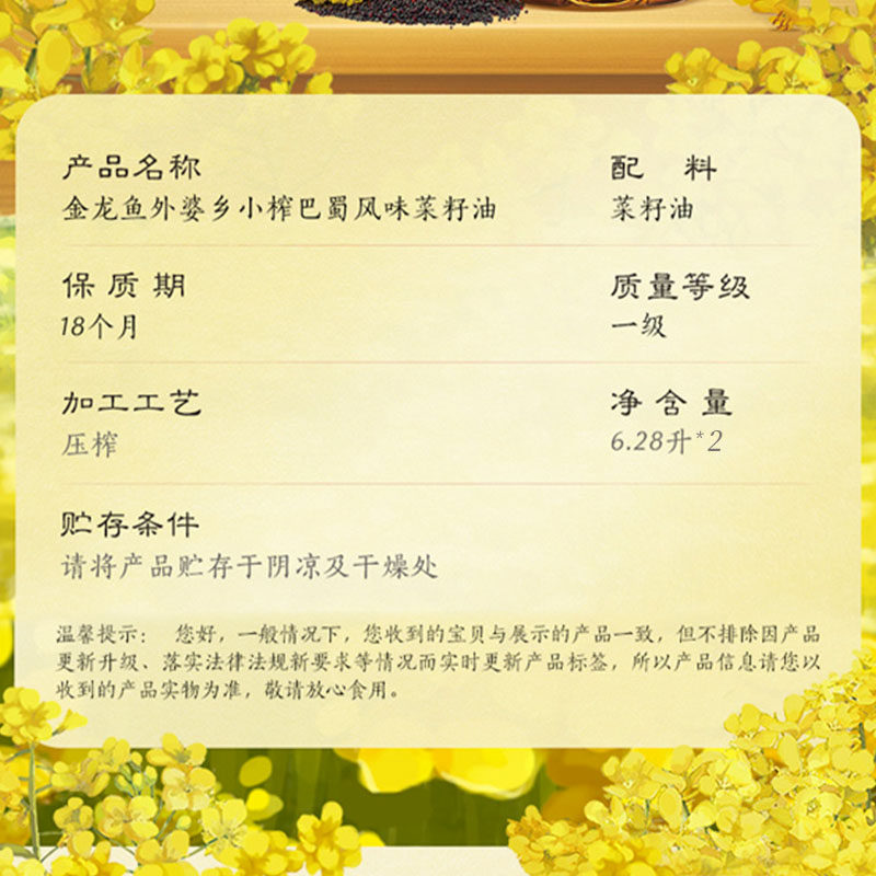 📚 金龙鱼外婆乡小榨巴蜀风味菜籽油6.28L*2桶