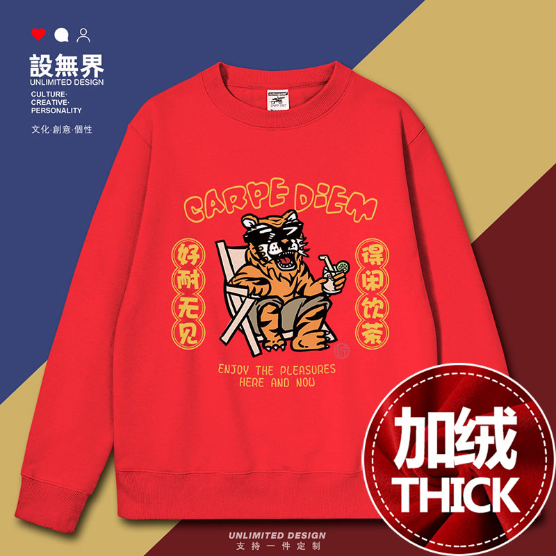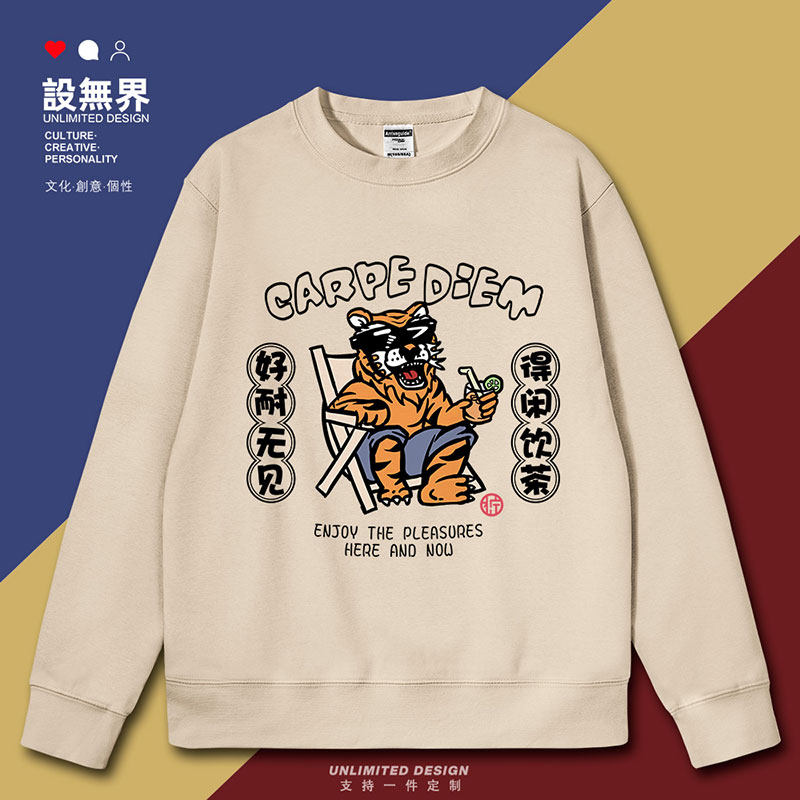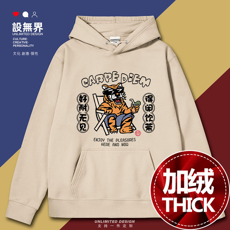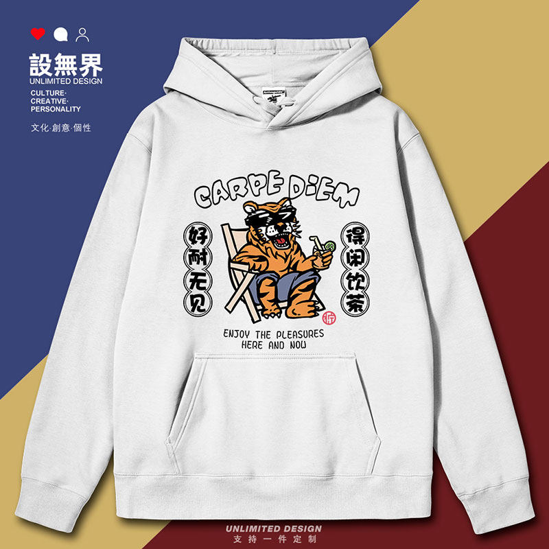 📚 原创卡通老虎得闲饮茶粤语文化连帽卫衣男女港风潮牌衣服设 无界