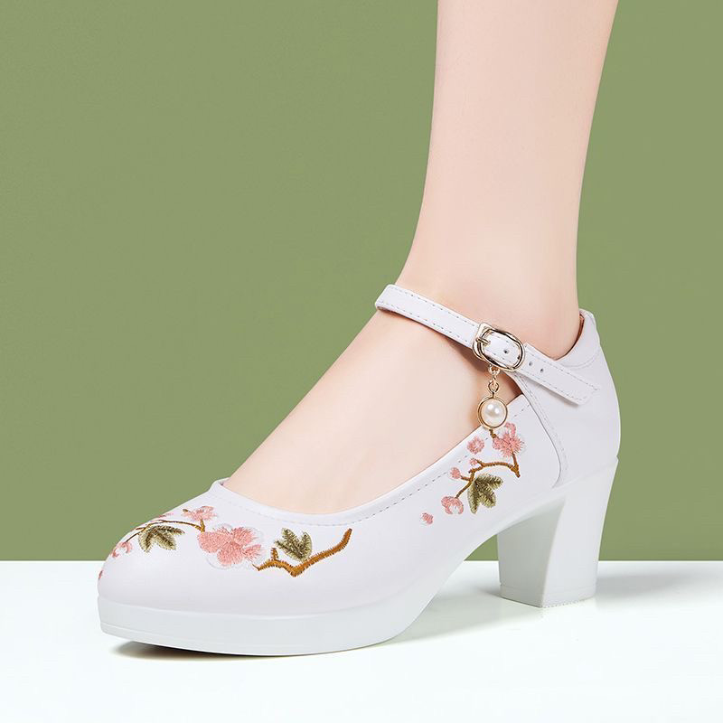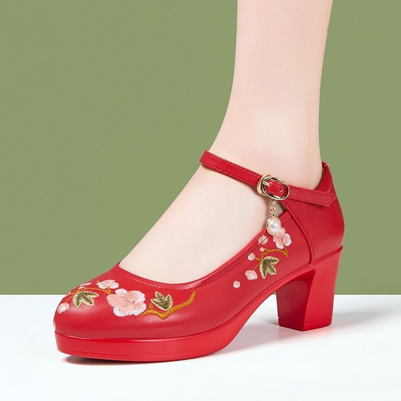 📚 民族风圆头大码绣花鞋女古风时尚百搭汉服鞋模特旗袍走秀高跟单鞋