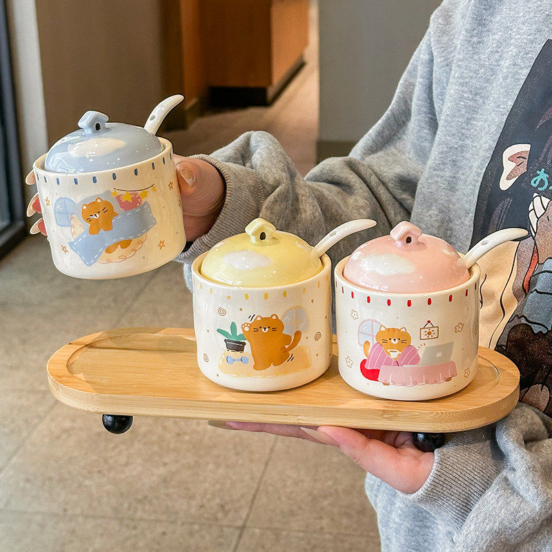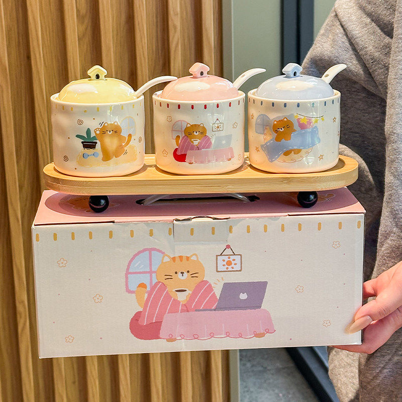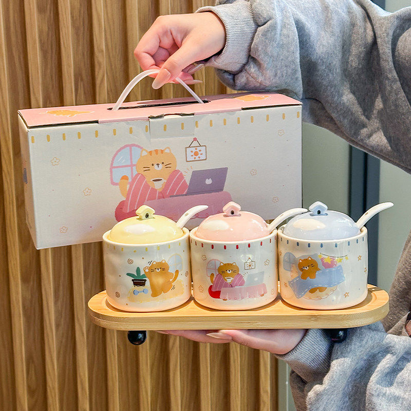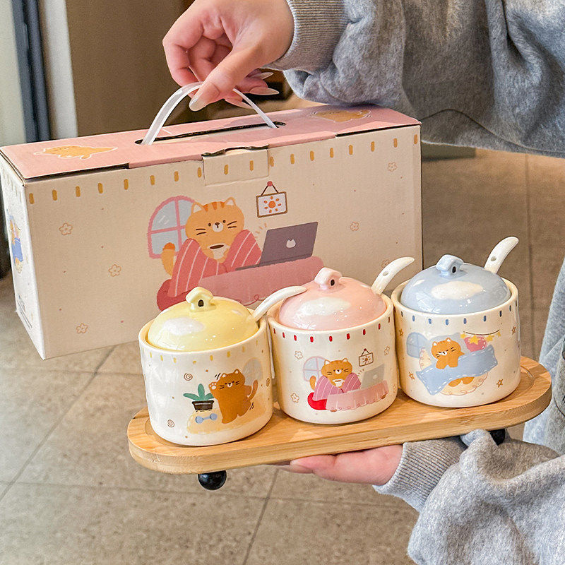 📚 可爱小屋猫咪陶瓷调味罐套装辣椒油罐盐罐带勺厨房家用味精调料盒