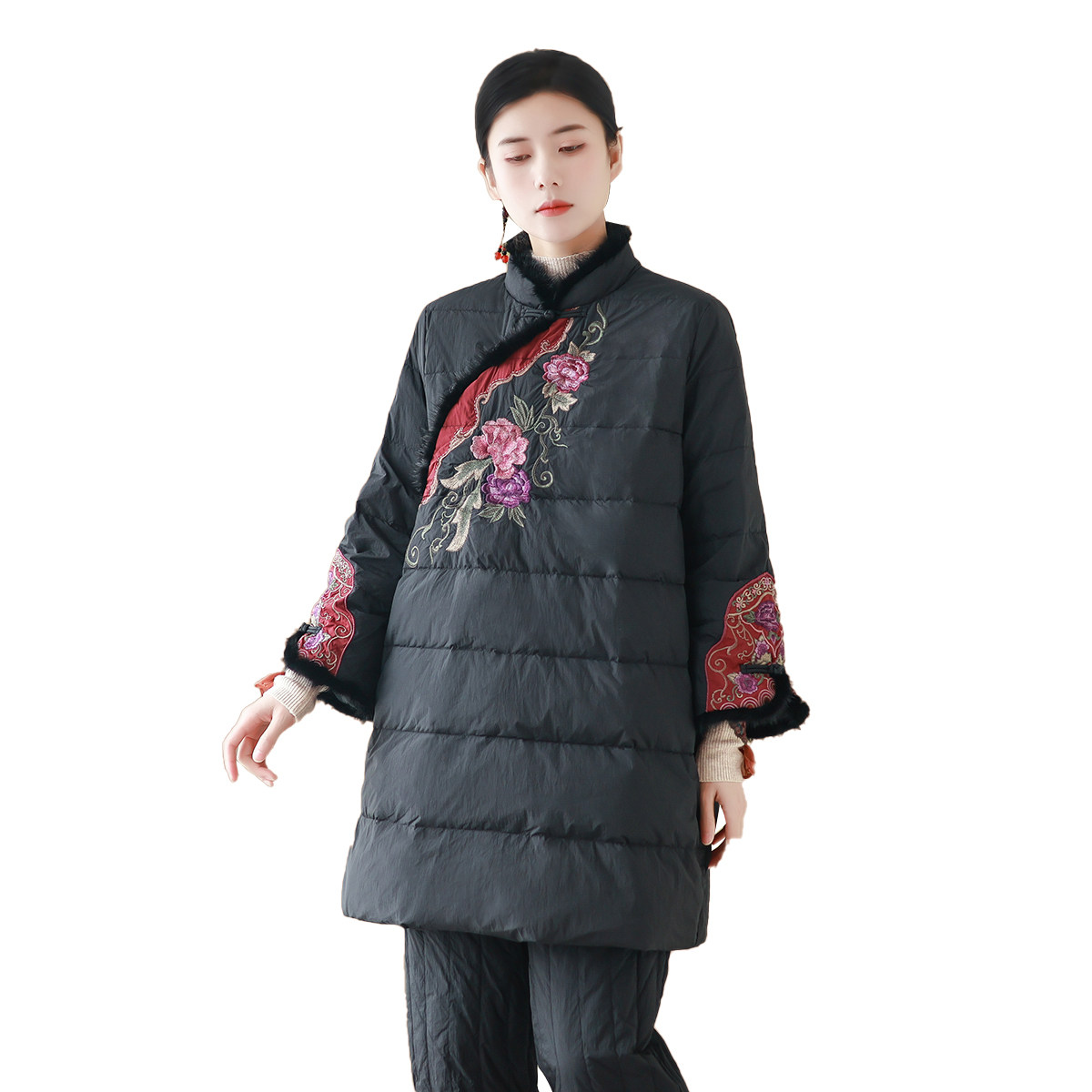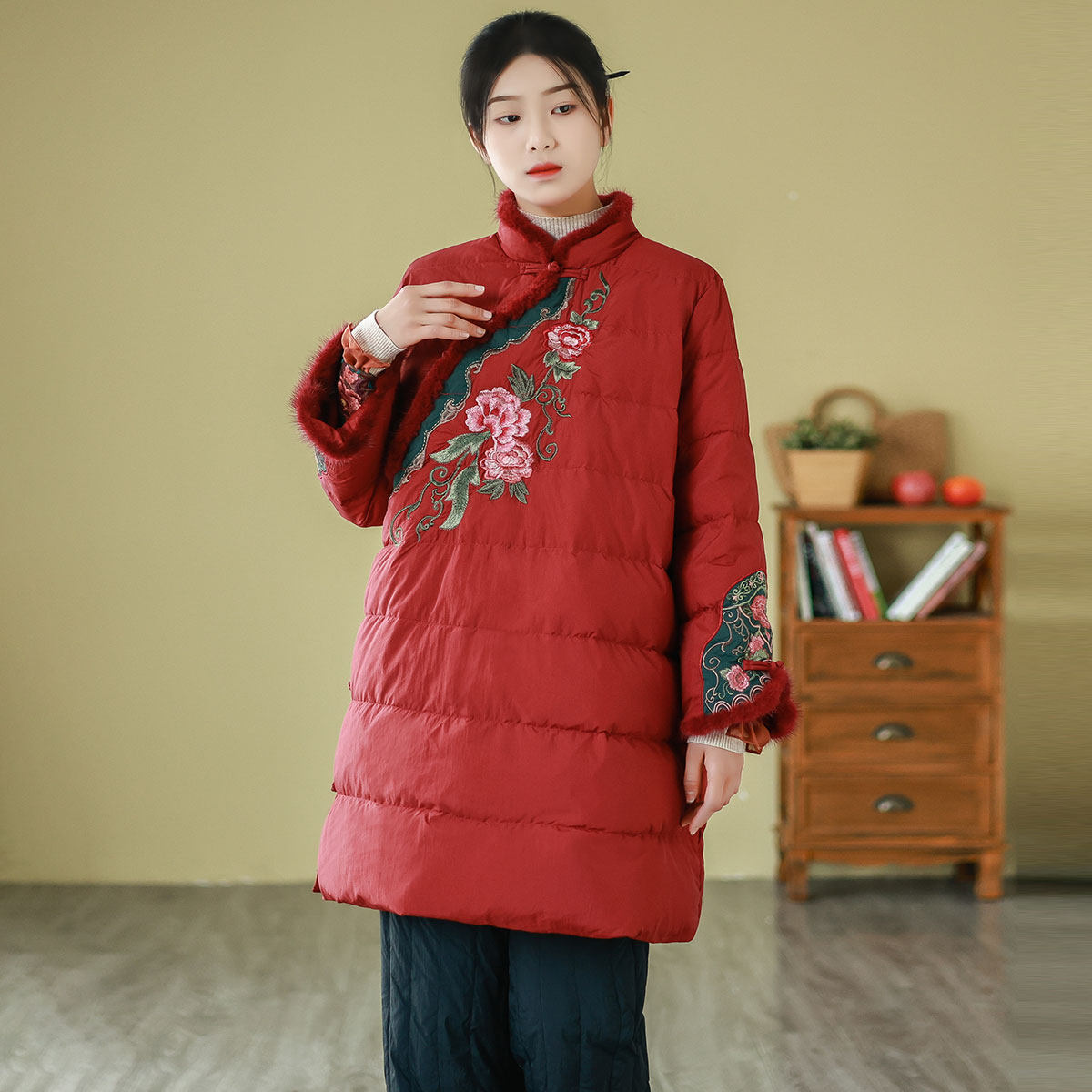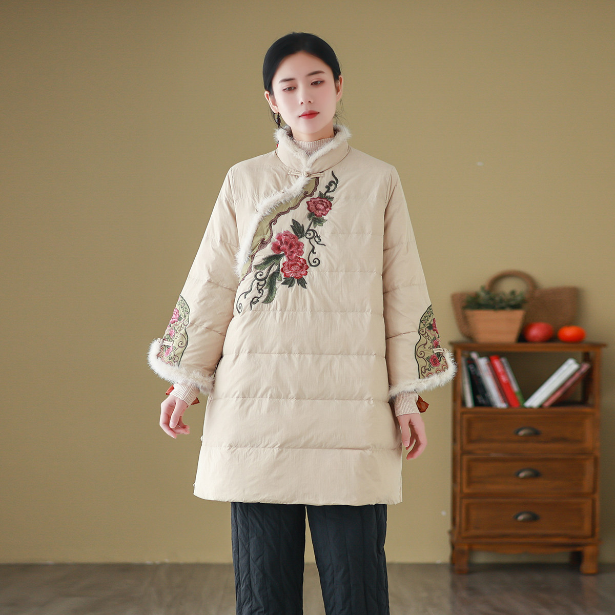 📚 民族风中长款羽绒服2025年女装新款复古国风毛边重工刺绣斜襟外套
