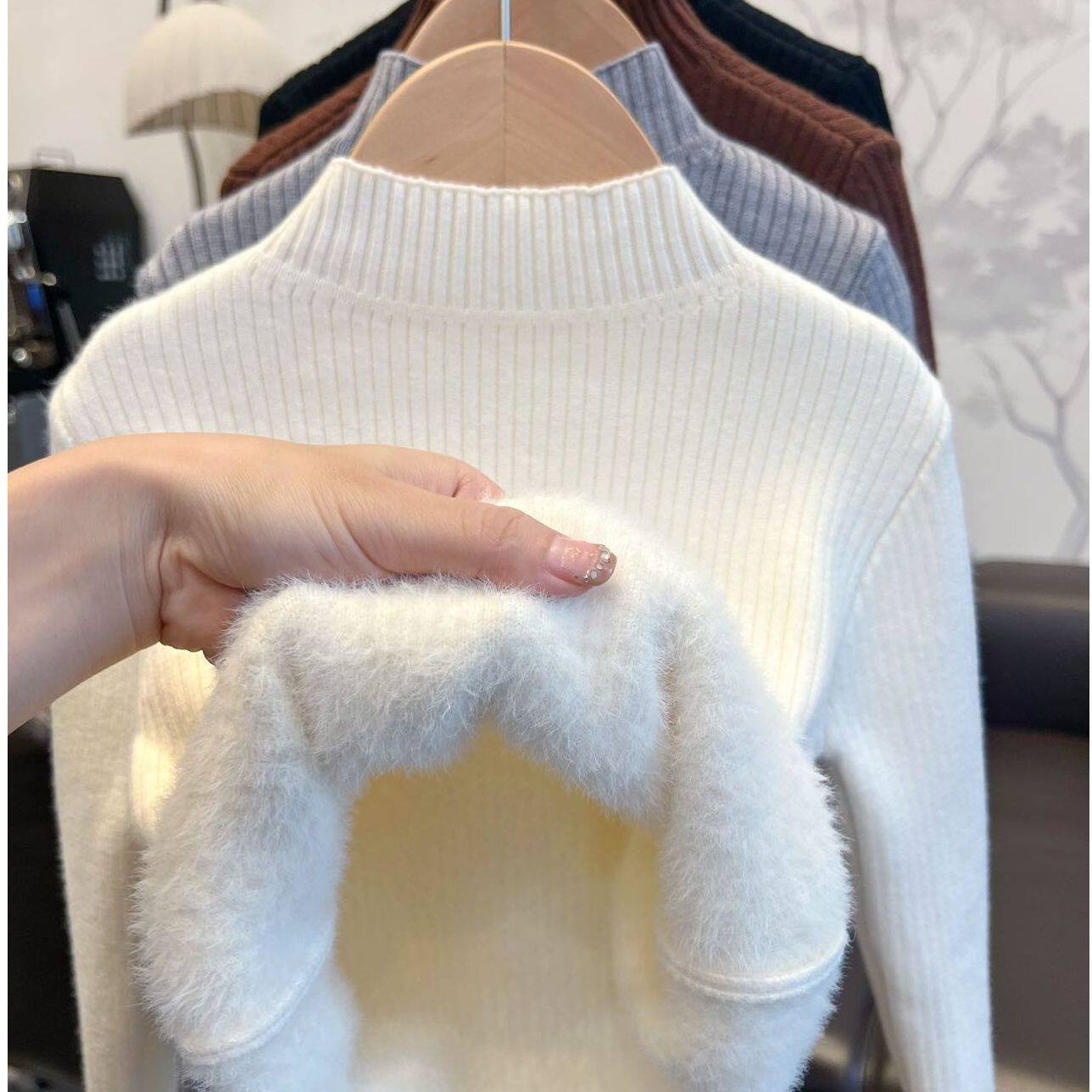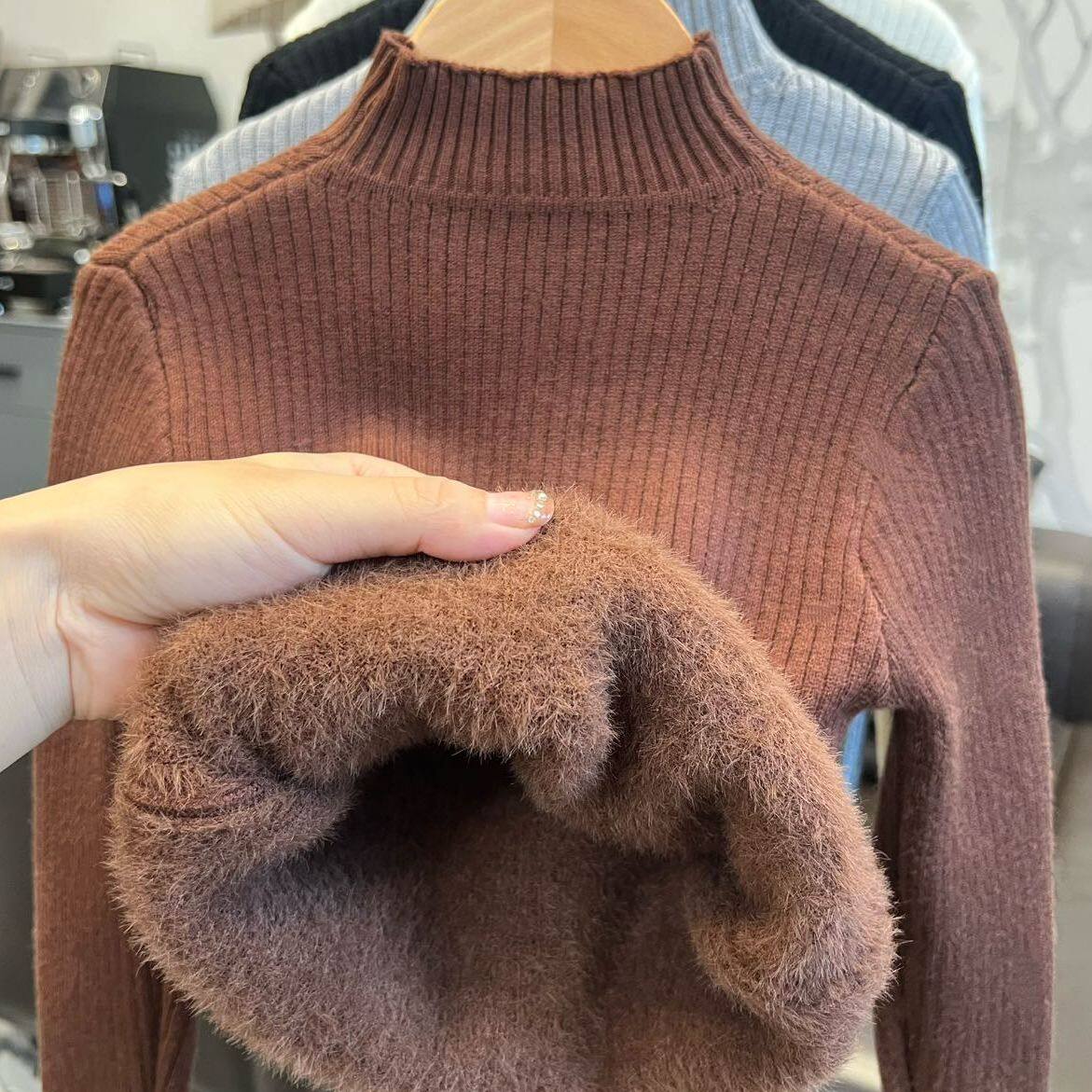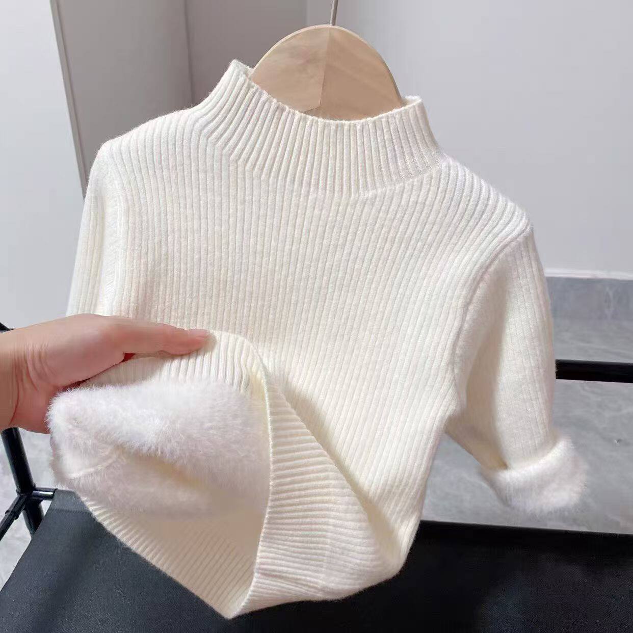 📚 冬季新款儿童加绒加厚打底针织衫纯色半高领一体绒毛衣弹力男女童