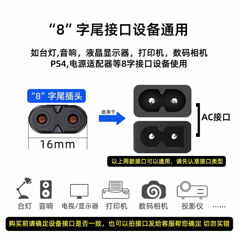 📚 适用TCL t7l/t6l pro电视机电源线加延长线65寸二插两孔8字2弯头