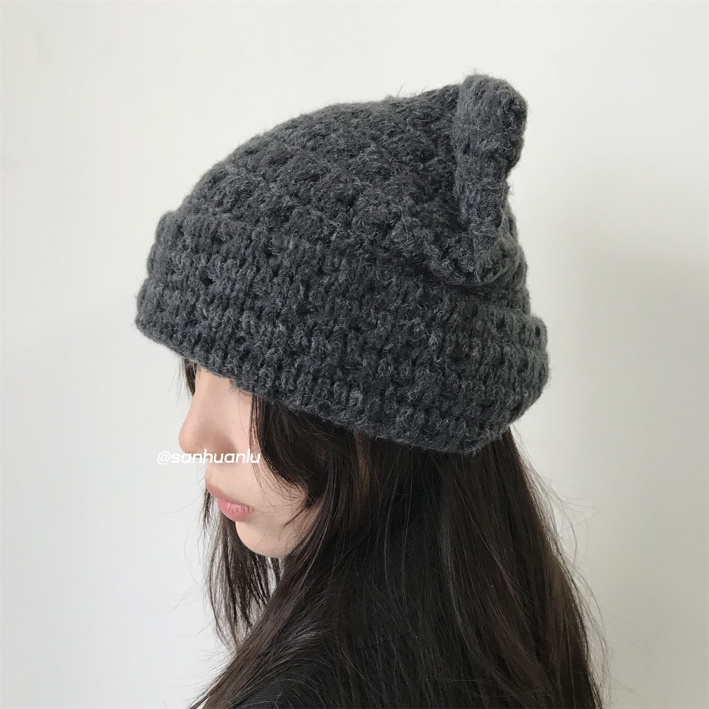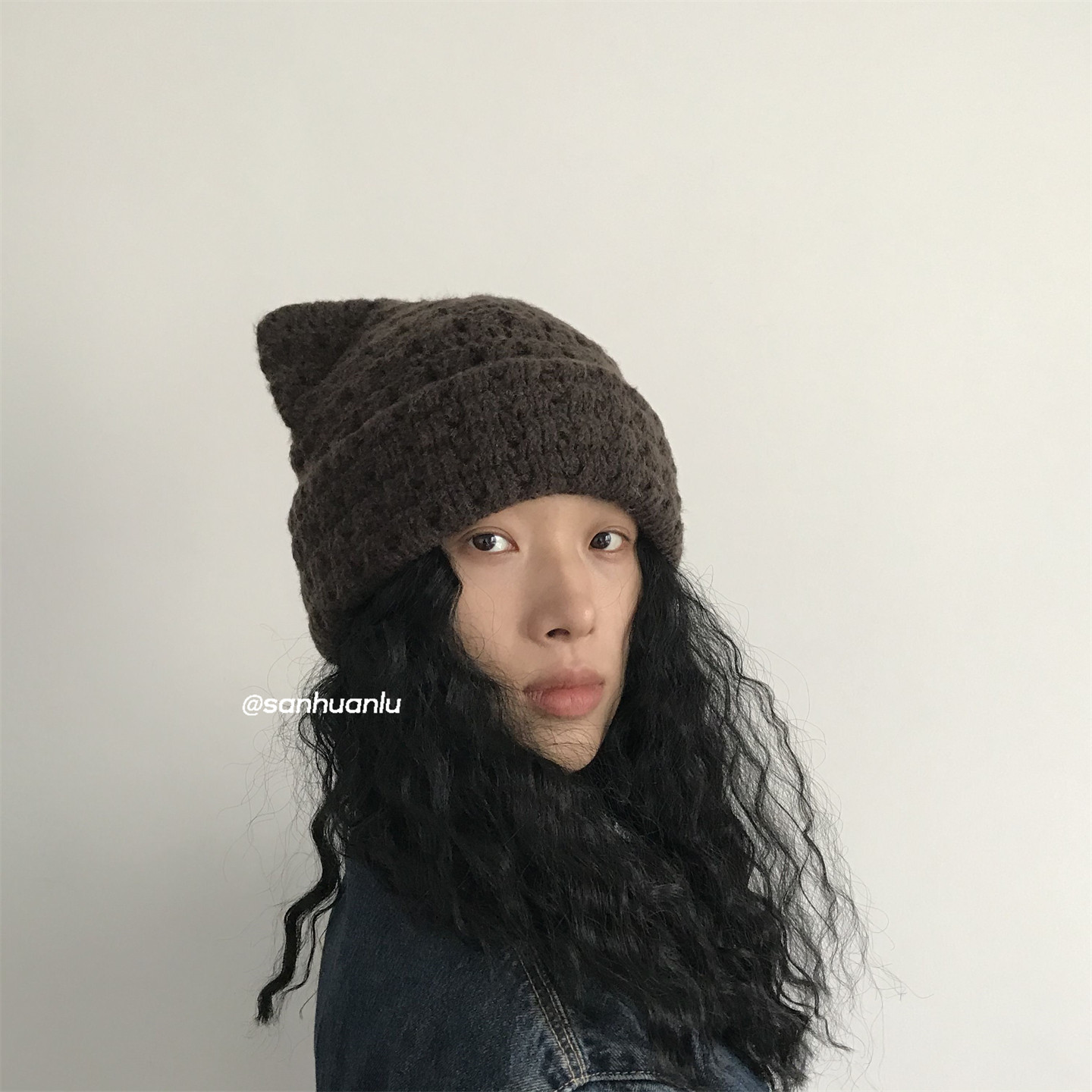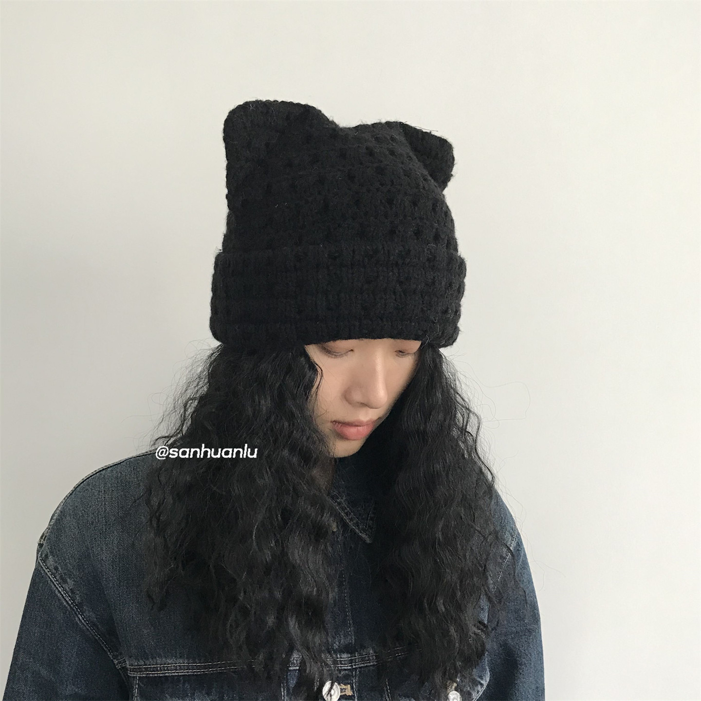 📚 三环路甜美镂空猫耳包头帽纯色针织毛线帽小众时尚文艺猫耳包头帽