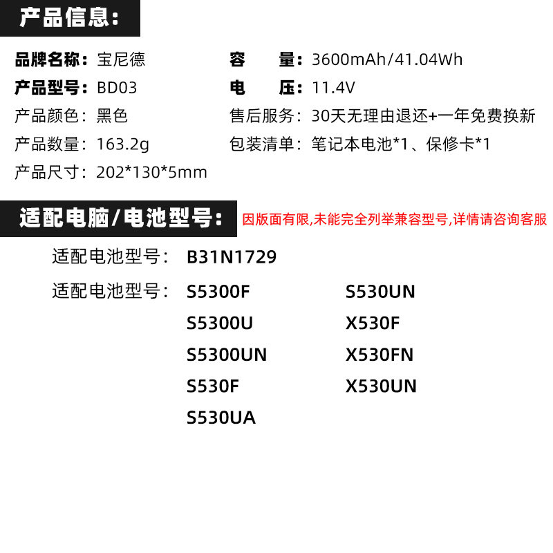 📚 适用华硕灵耀S2代 S5300F/U/UN S15 X530FN B31N1729 笔记本电池