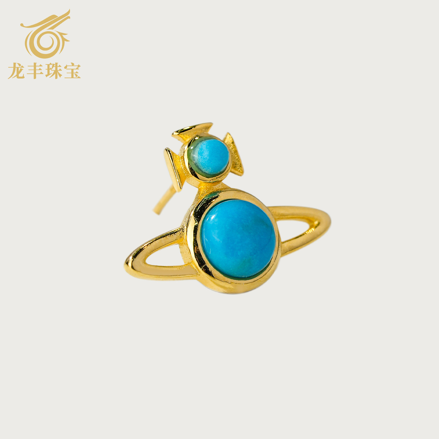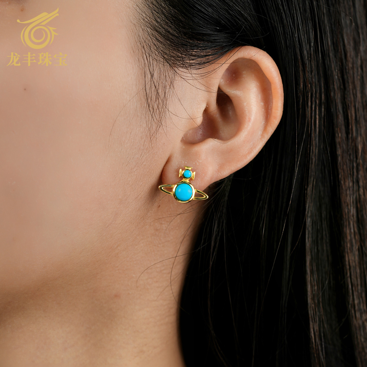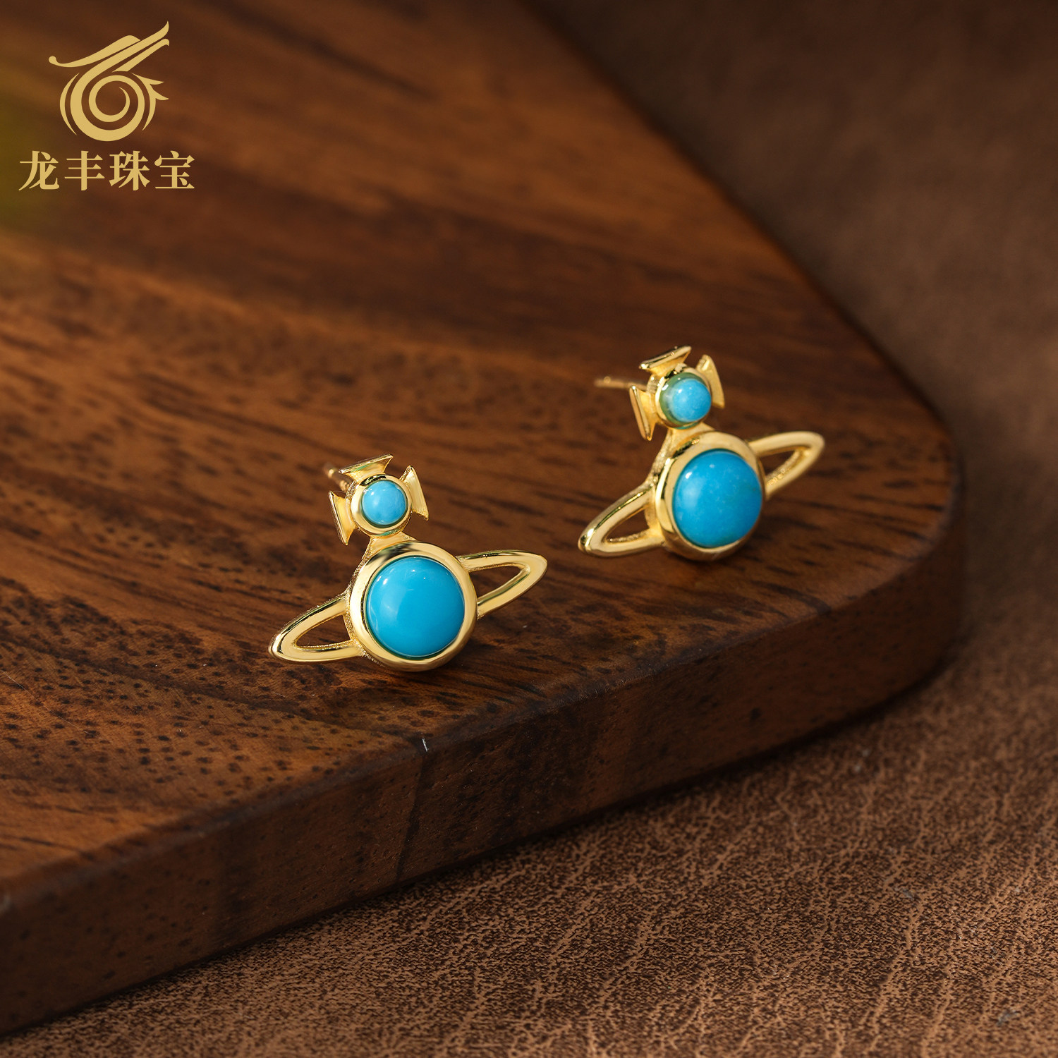 📚 龙丰绿松轩S925银镀18k金天然绿松石百搭土星球耳钉女款简约轻奢