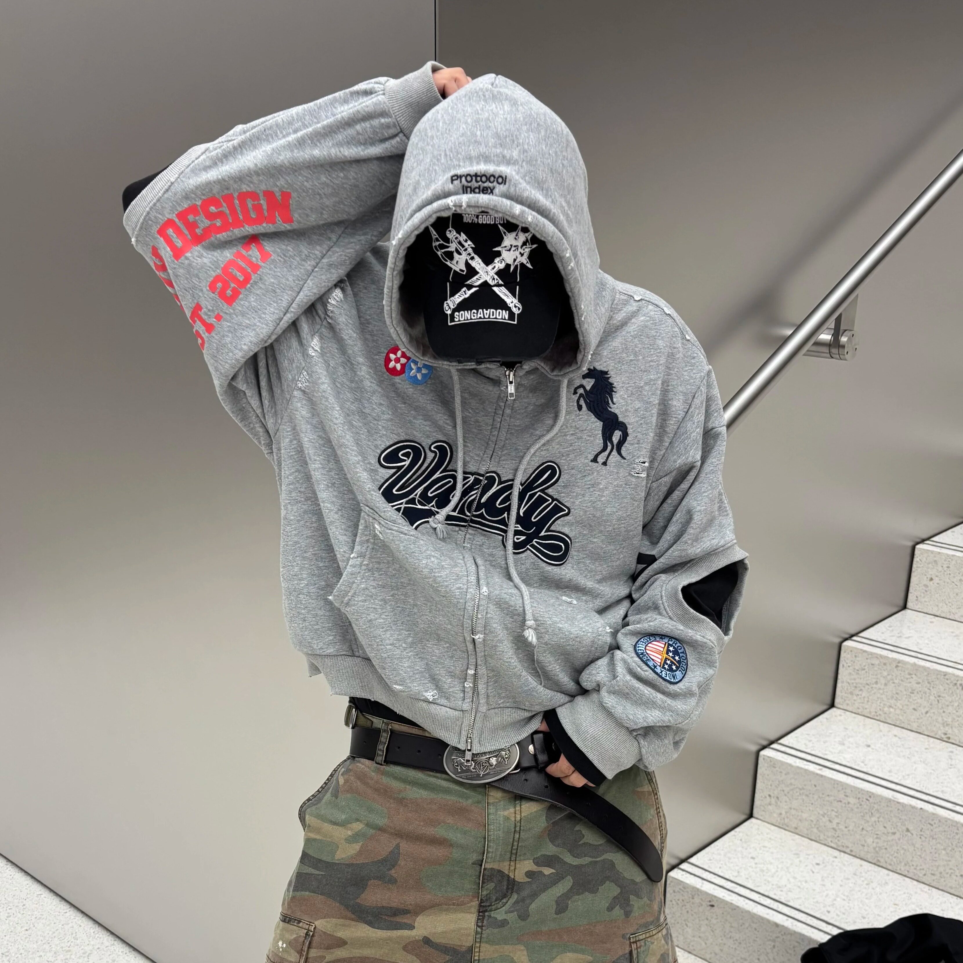 📚 Grailz LEARL Vandythepink 25FW联名款做旧拼接战马连帽拉链卫衣