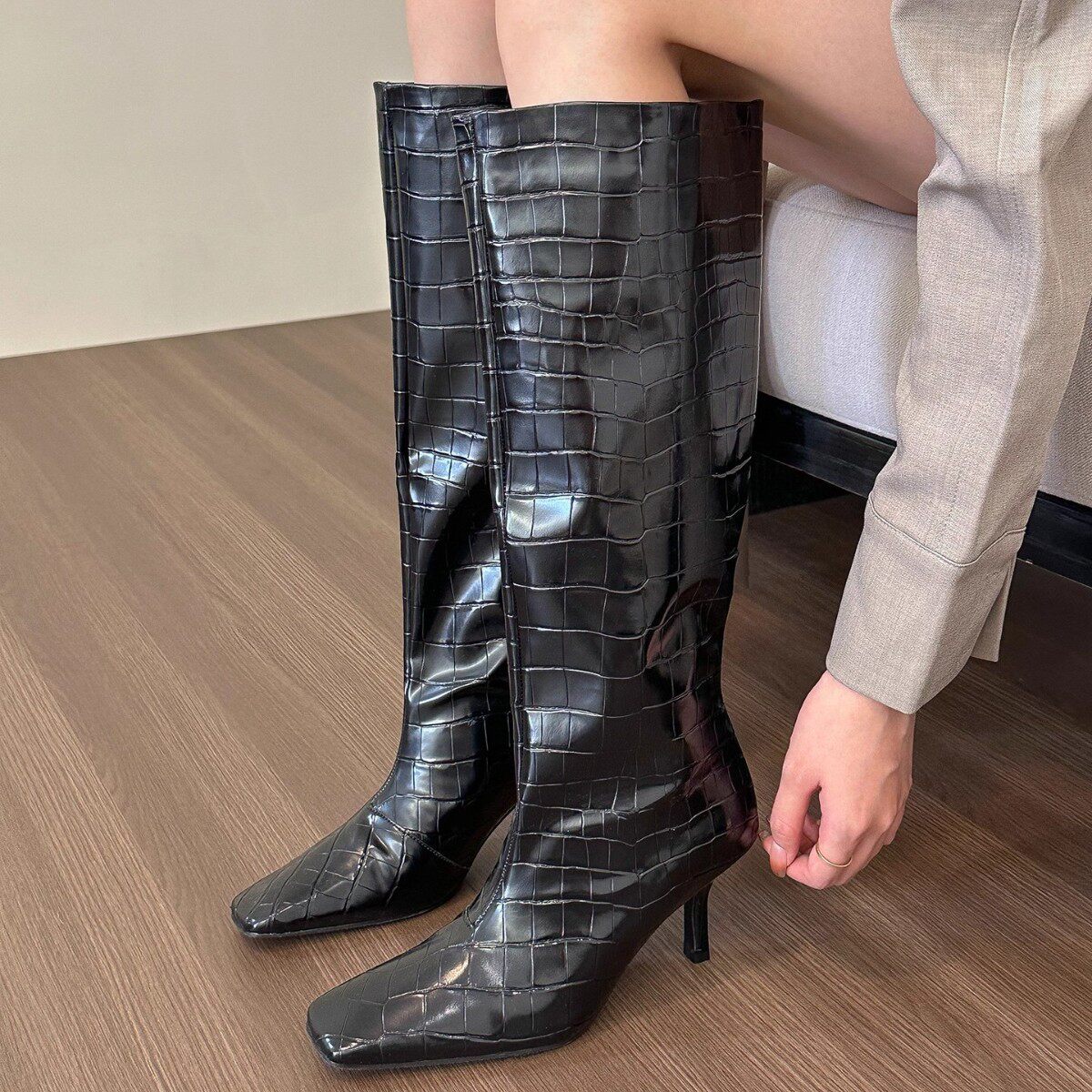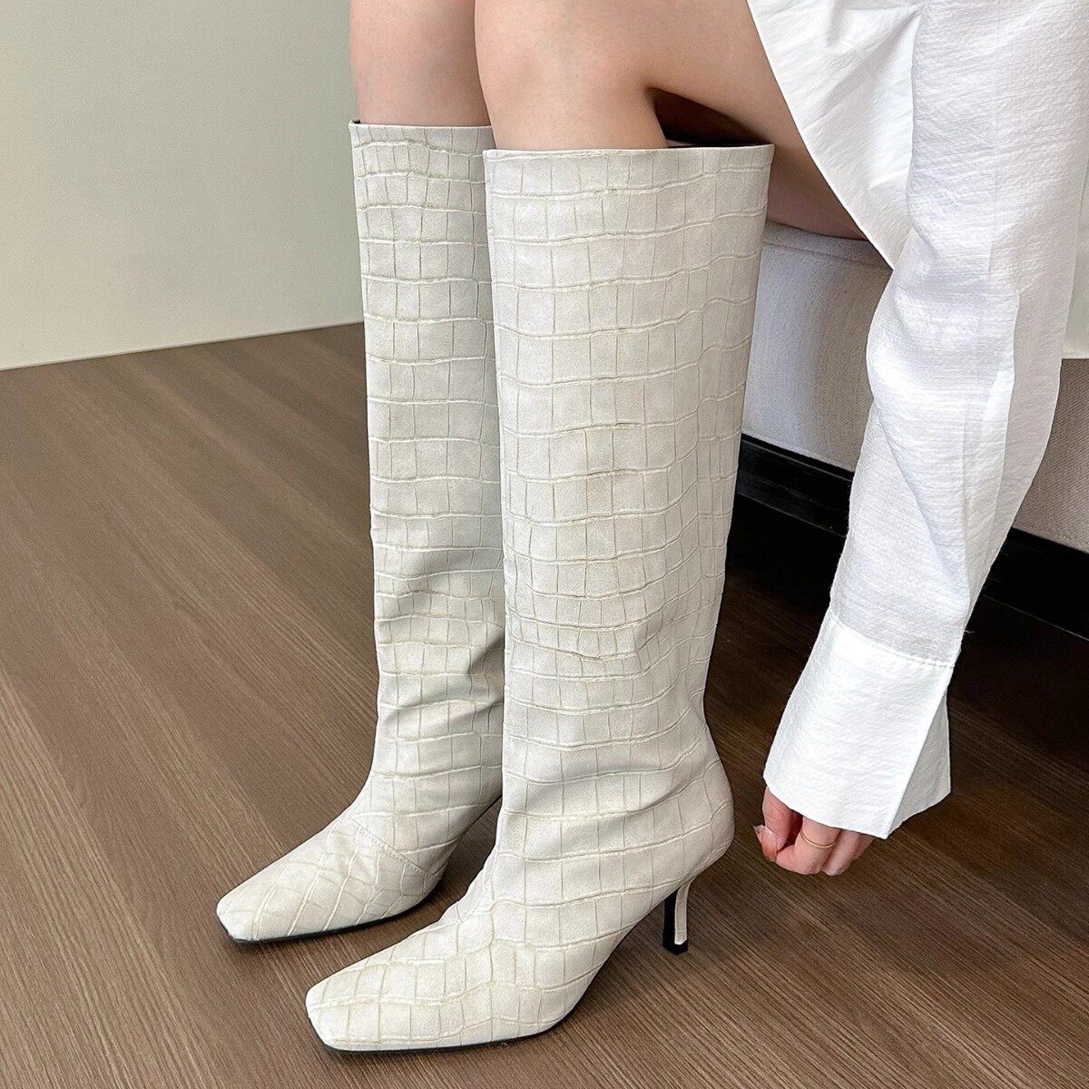 📚 2026新款Mona同款方头高跟白色骑士靴鳄鱼纹高筒欧美不过膝长靴子