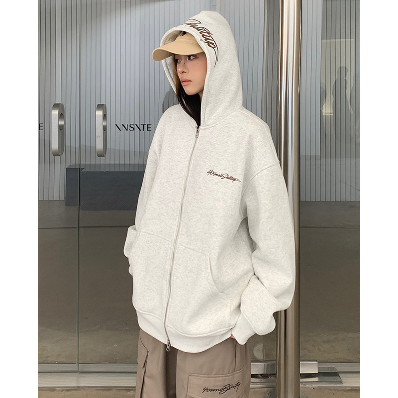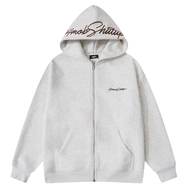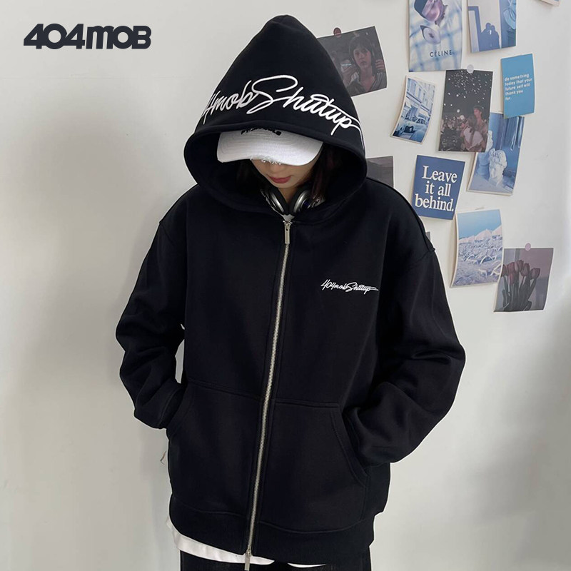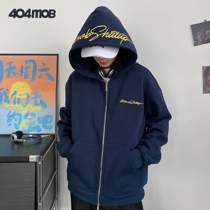 📚 404MOB复古美式秋冬花体字母刺绣连帽开衫卫衣男休闲潮流加绒外套
