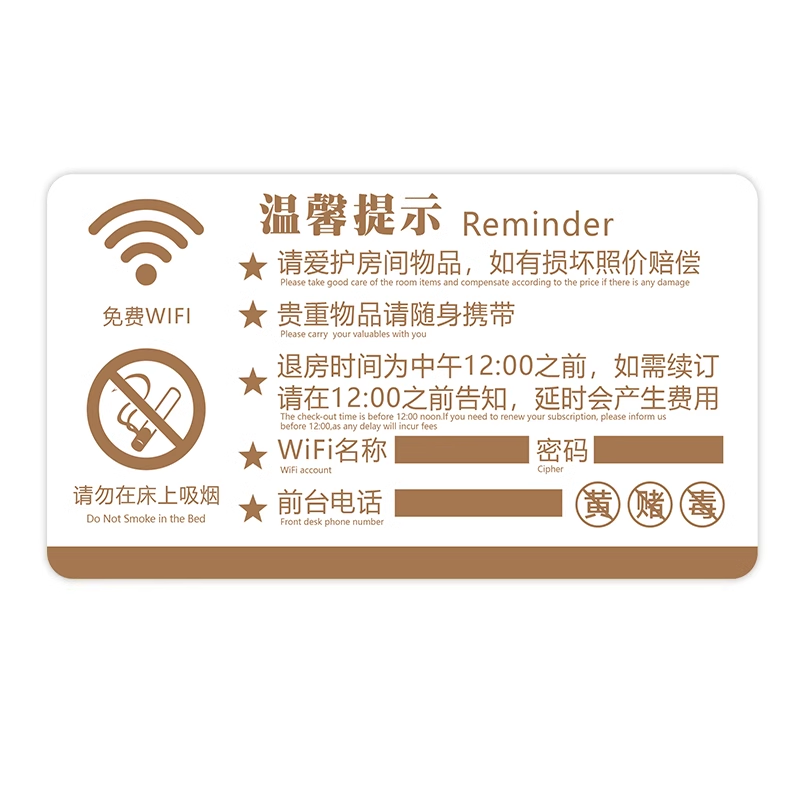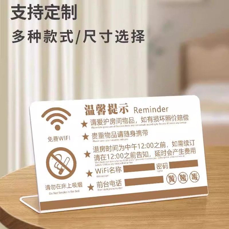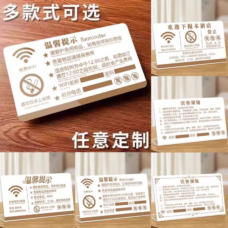 📚 酒店客房温馨提示牌宾馆前台房间wifi密码无线网亚克力床头请勿卧床吸烟立牌民宿禁止黄赌毒标识标牌贴纸定制