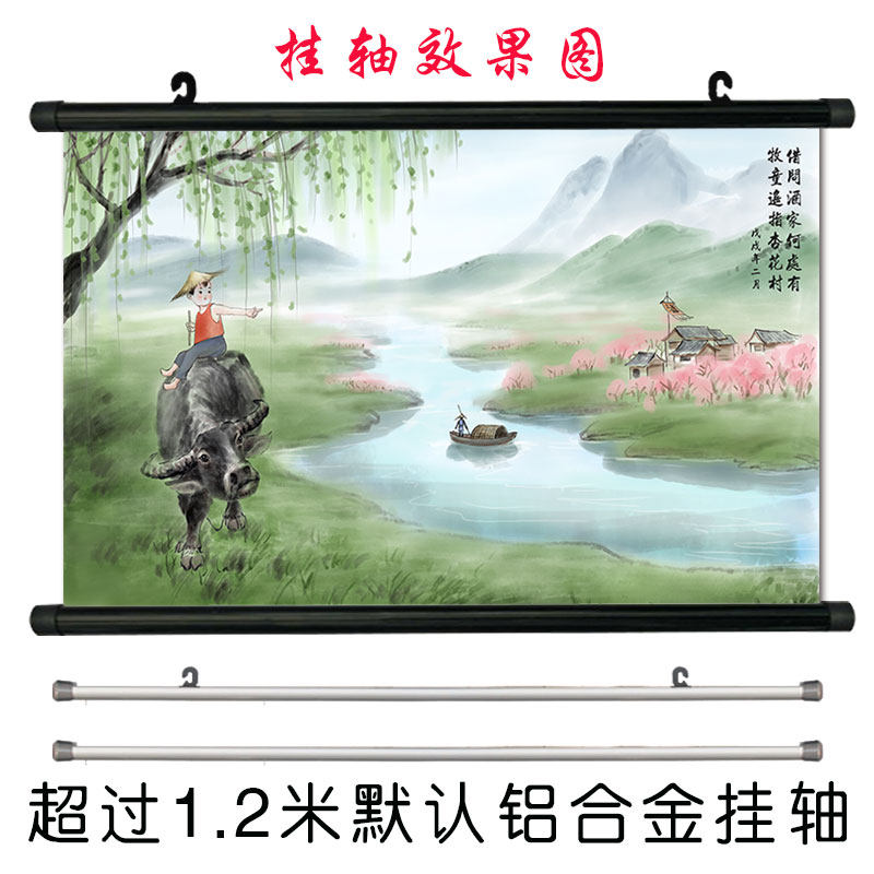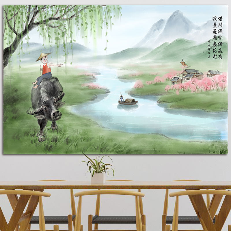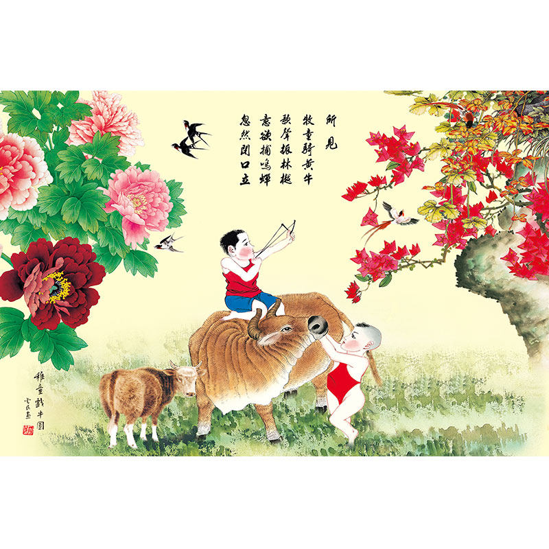 📚 牧童骑黄牛风水玄关挂画春牛图牧牛图防水自粘画招财牡丹玄关壁画