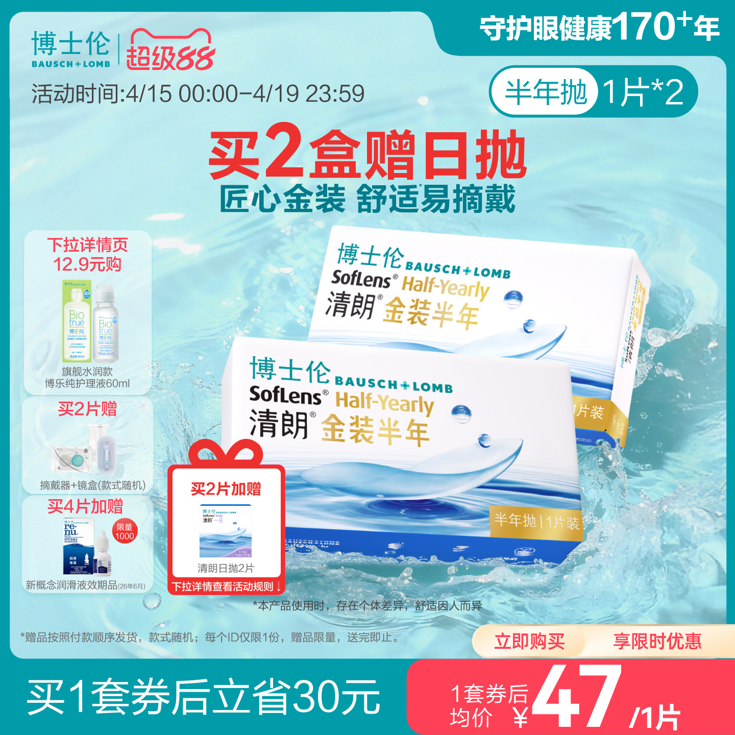 📚 博士伦隐形眼镜半年抛清朗金装近视透明镜片高度舒适水润旗舰正品