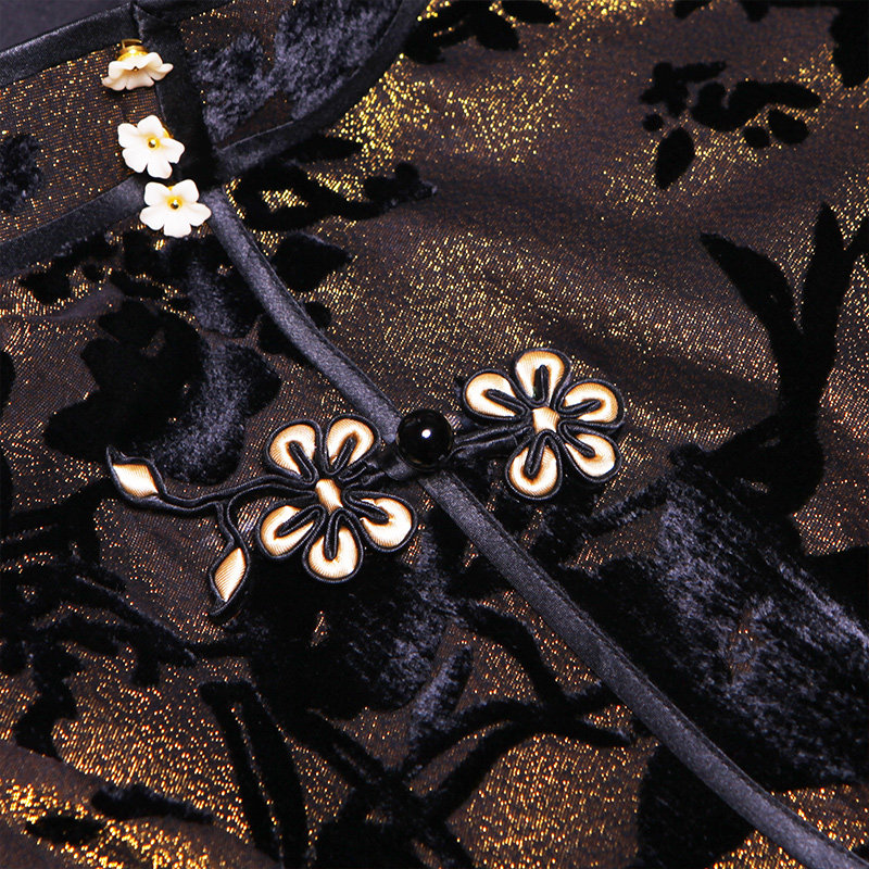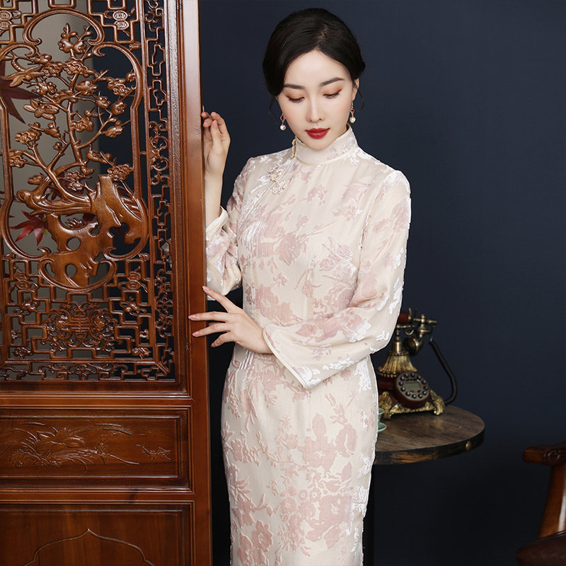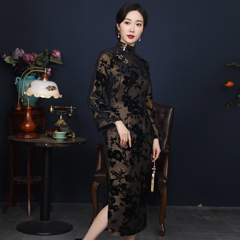 📚 蝶恋花之流溢 旗袍春秋款复古长袖真丝烂花绒崔万志旗袍连衣裙女