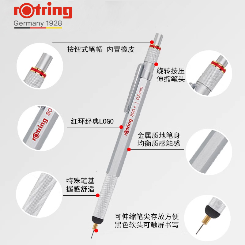 📚 [免费刻字服务]德国rotring红环800+自动铅绘图制图金属铅笔工程专业学生用绘画自动铅电容笔触控笔送礼文具