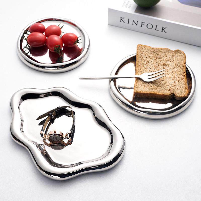 📚 ins简约首饰托盘摆件收纳轻奢复古银色陶瓷饰品盘子装饰创意