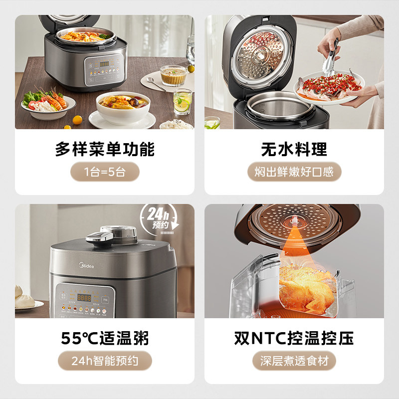 📚 美的电压力锅iH家用不锈钢5L大容量双胆旗舰店电饭锅高压锅二合一