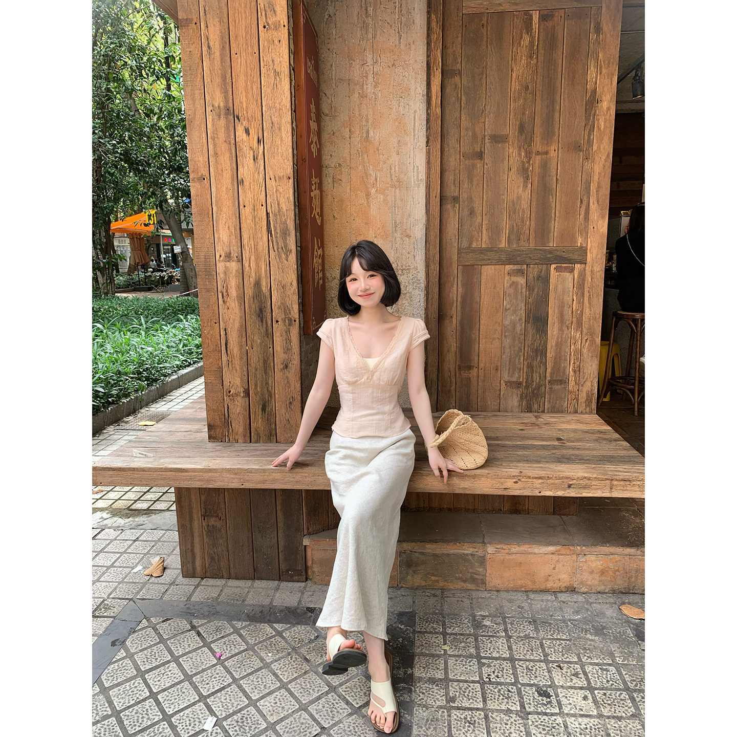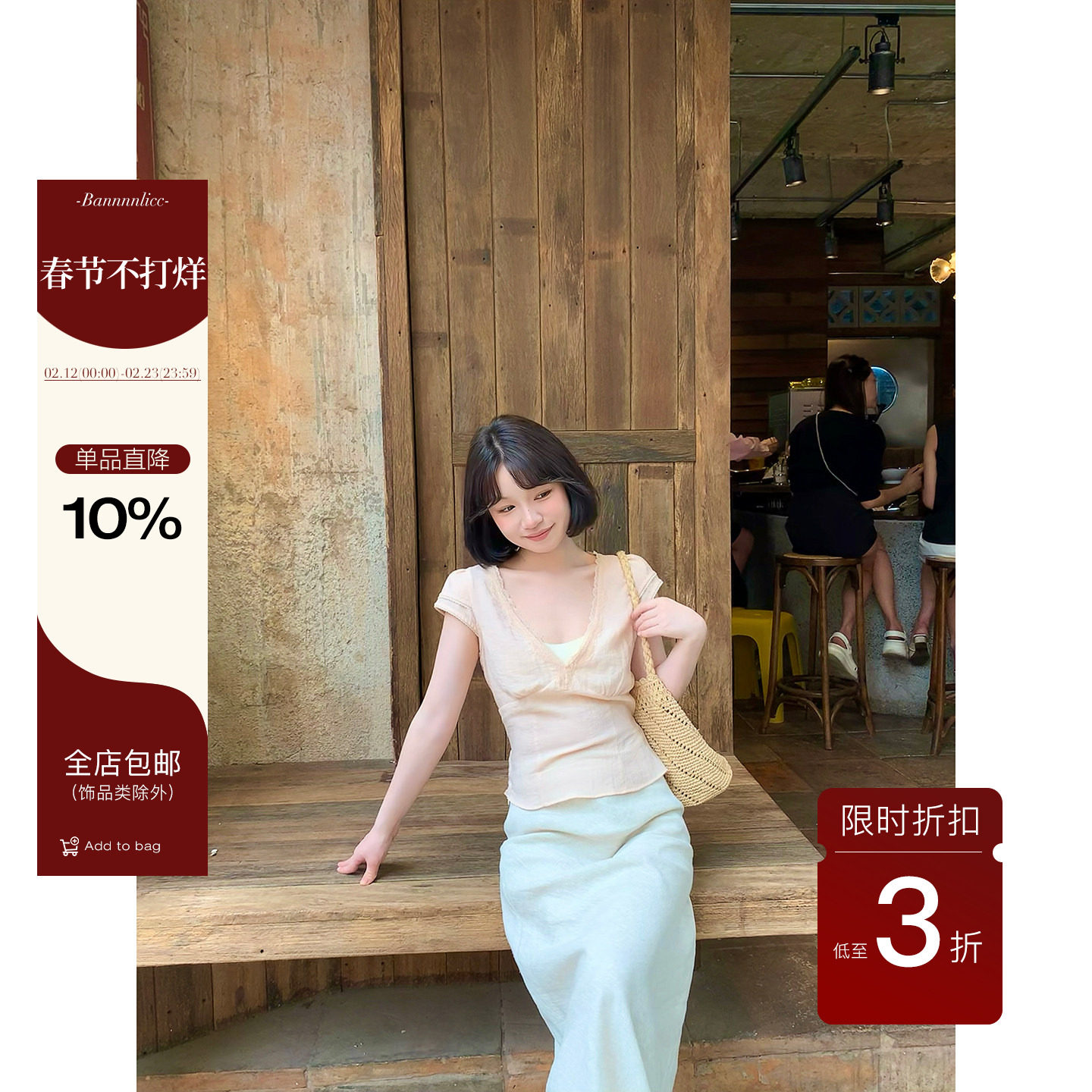 📚 板栗西西【私服穿搭】气质深V领蕾丝花边收腰上衣女夏显瘦收腰T恤