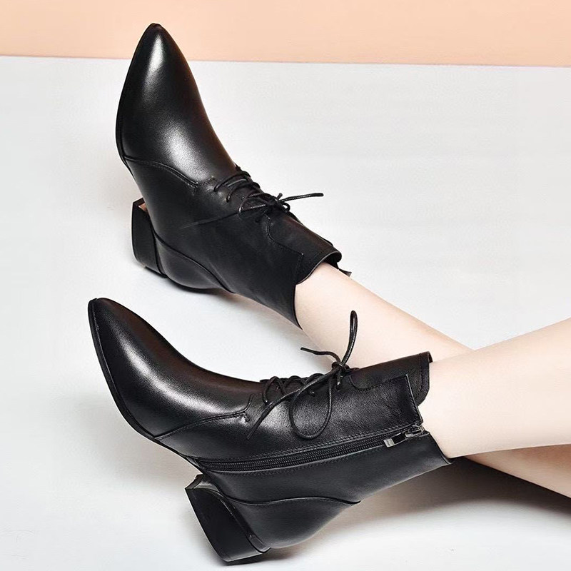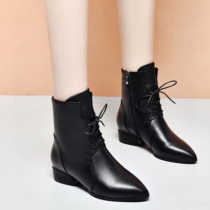 📚 真皮中筒靴女2025新款秋冬季尖头马丁靴系带皮鞋春秋单靴平底短靴