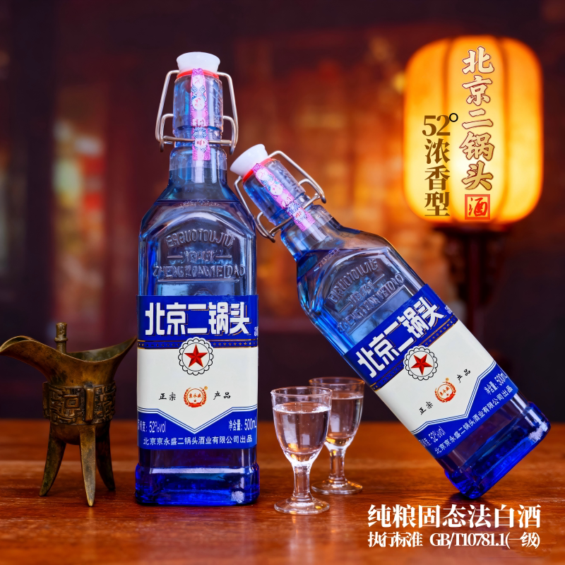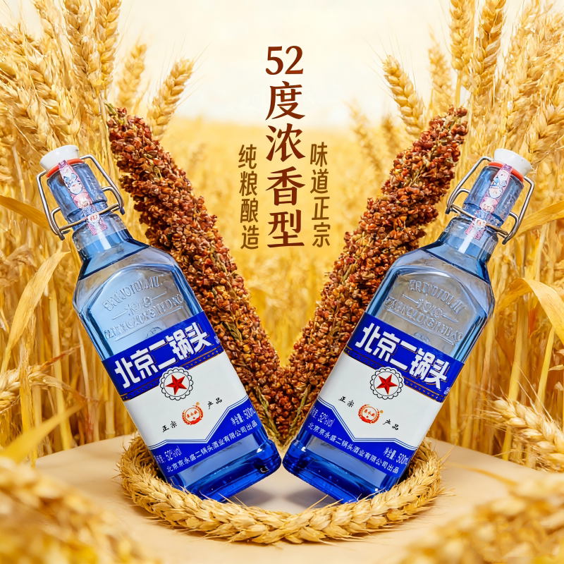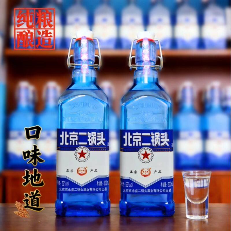 📚 52度蓝方瓶北京二锅头酒500ml*2瓶高度白酒出口型浓香型纯粮酿造