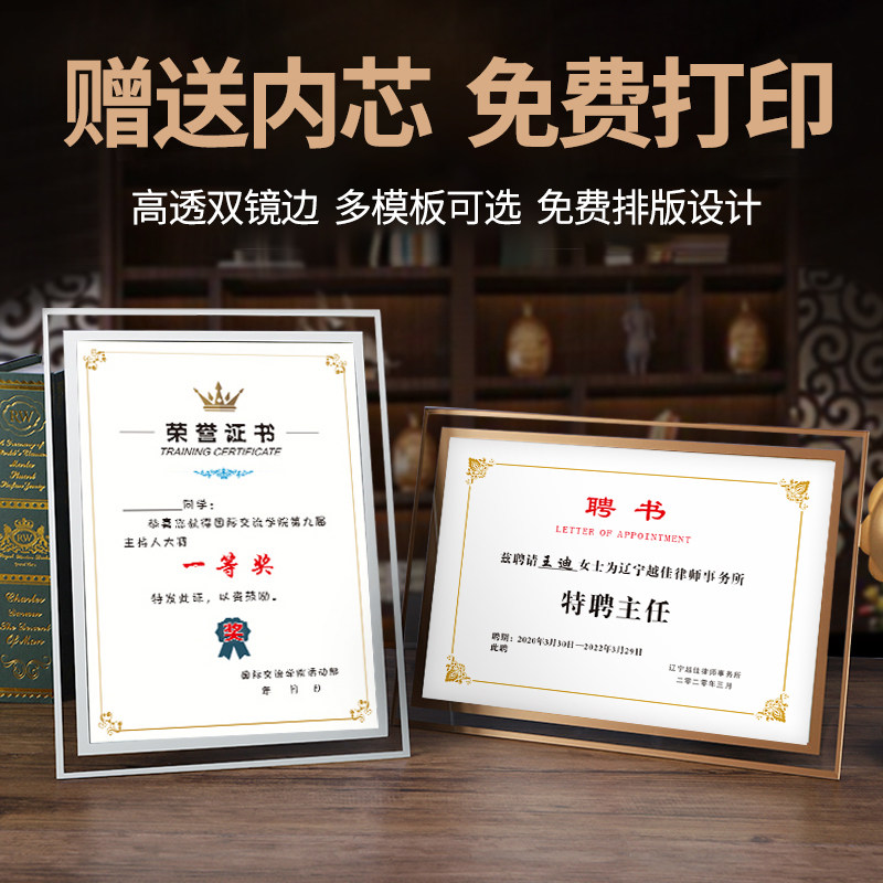 📚 水晶玻璃证书相框荣誉证书摆台获奖证书展示框聘书定制授权书结业证书奖状定制收藏捐赠感谢信荣誉颁奖证打印