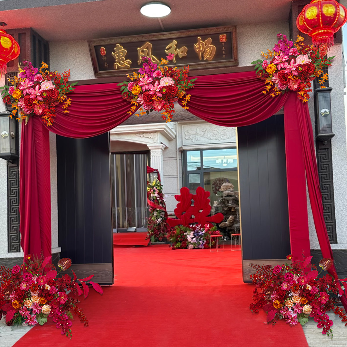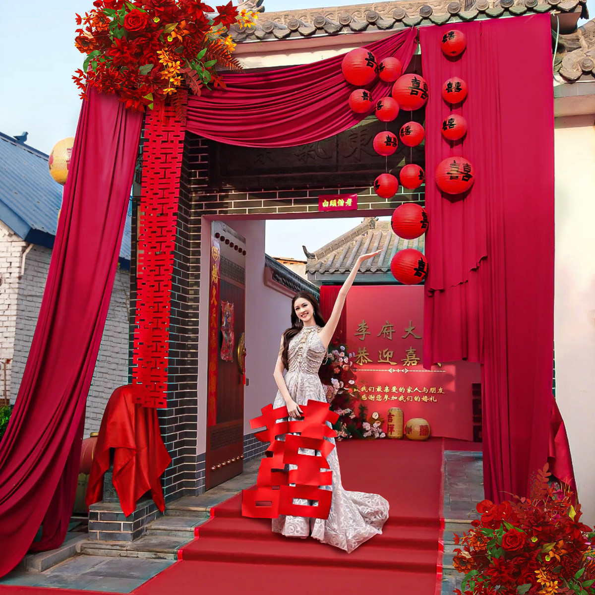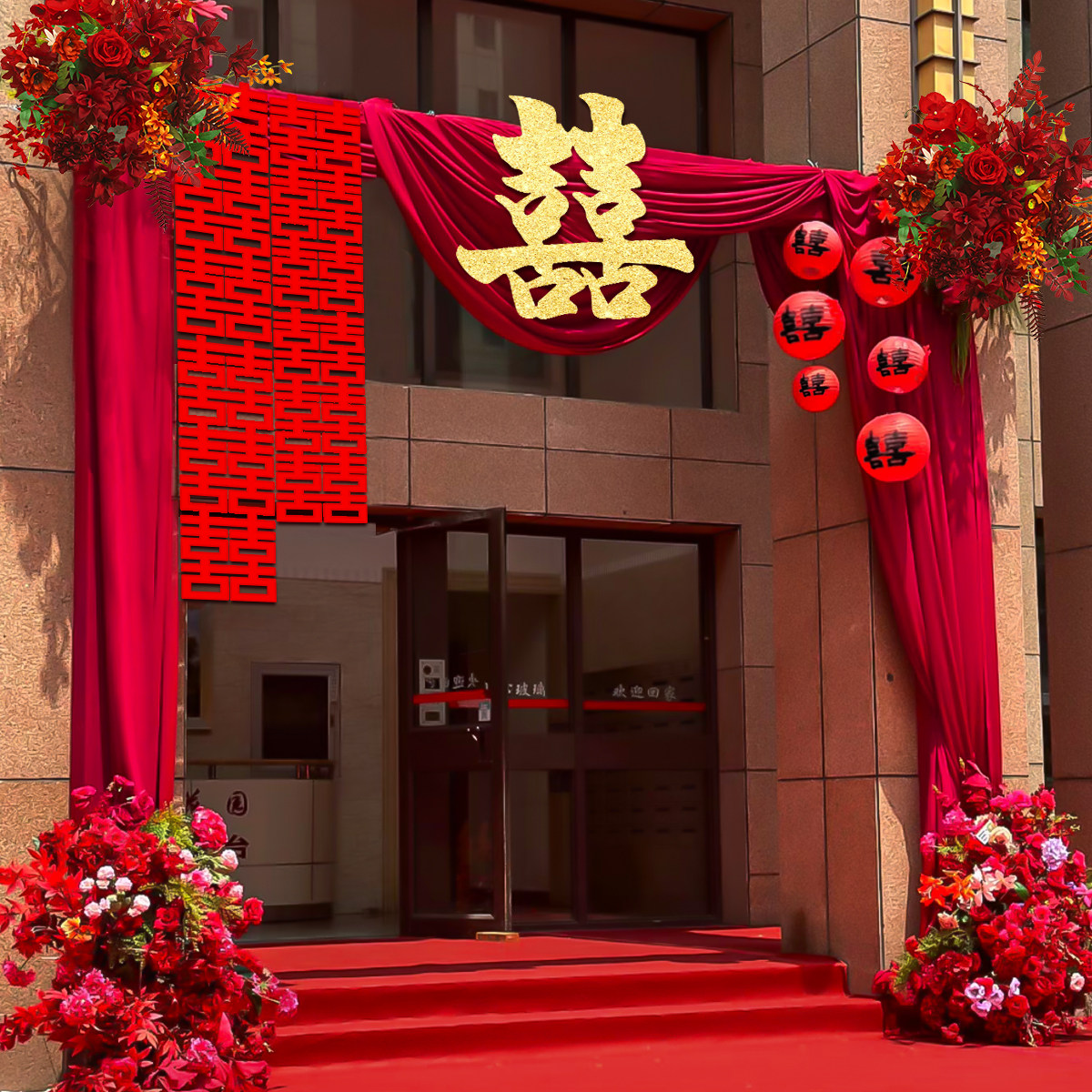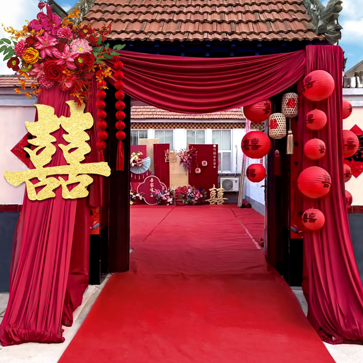 📚 结婚庭院装饰农村院子布置别墅布幔订婚礼长条喜字拉花红色灯笼挂