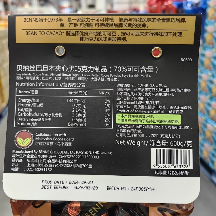 📚 BENNS70%黑巧克力贝纳丝果仁纯可可脂整颗坚果巴旦木开市客代购