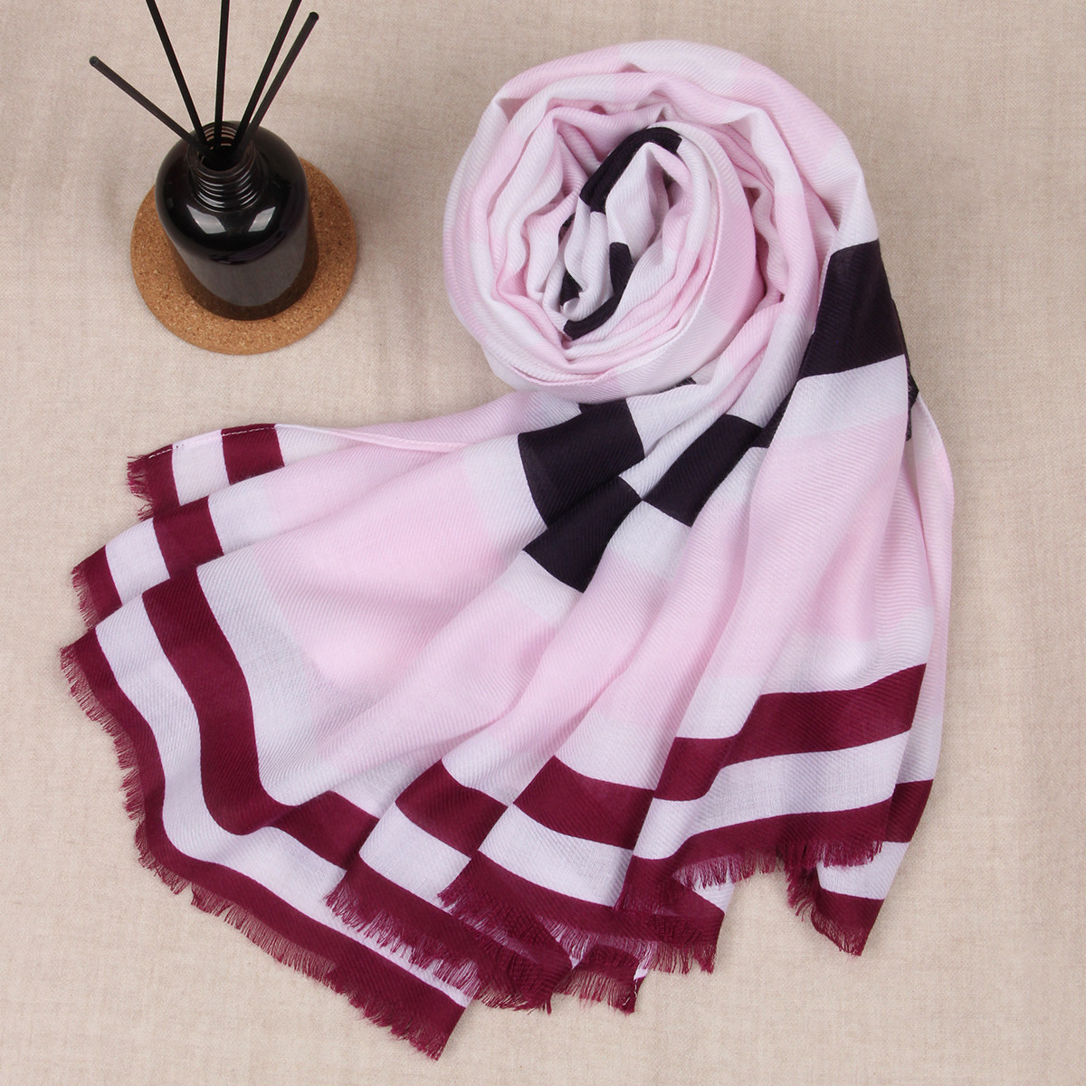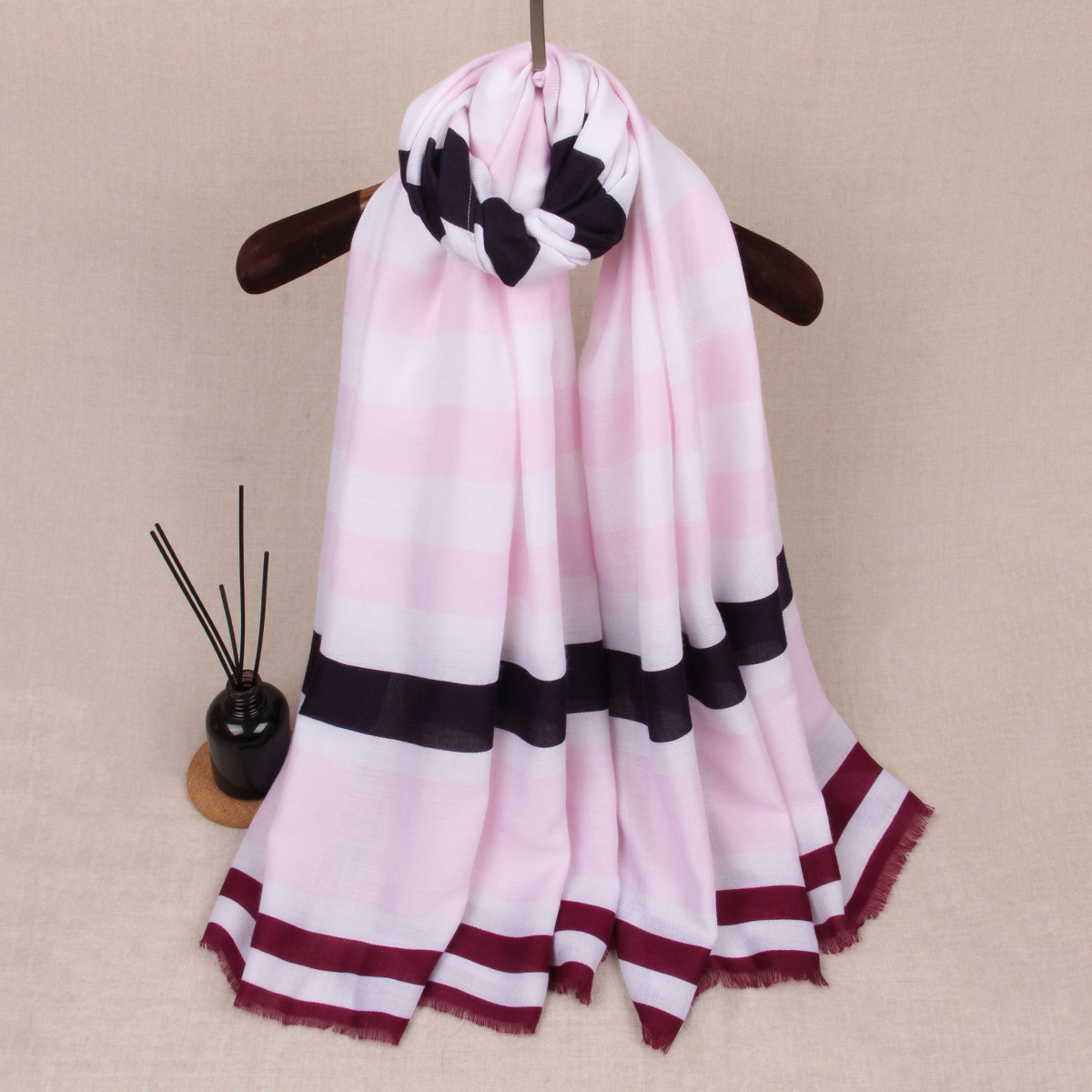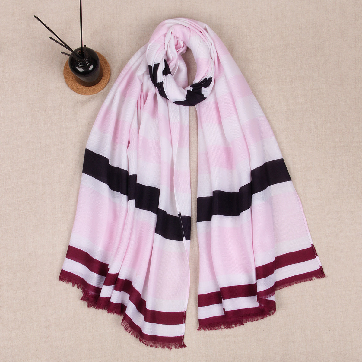 📚 欧美风秋冬中厚保暖休闲巴厘纱柔软粉白色条纹百搭女围巾披肩外贸