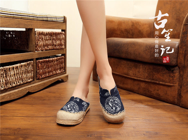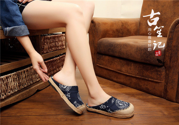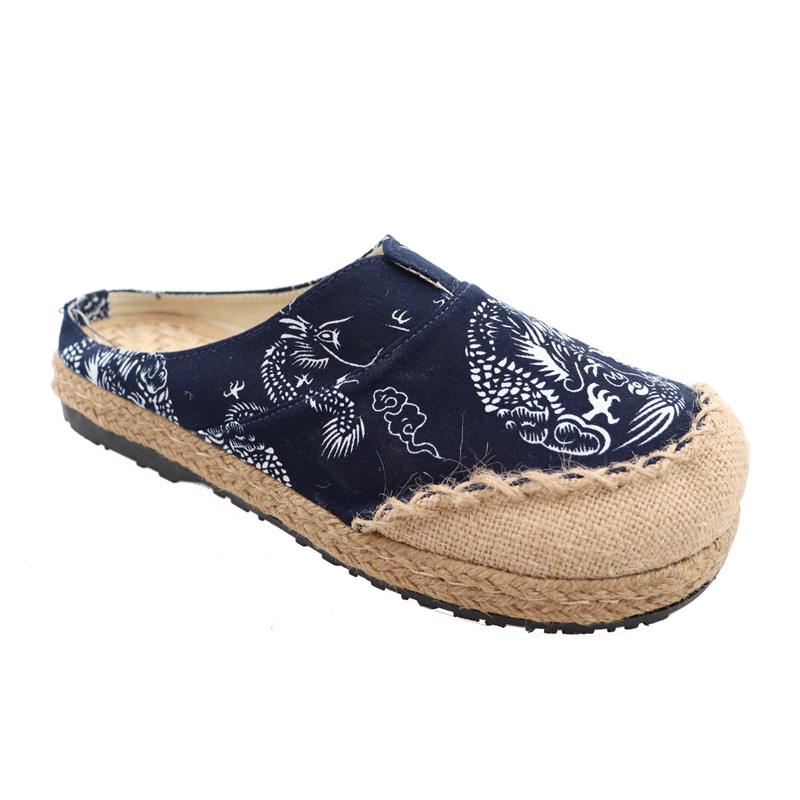 📚 复古新款亚麻龙腾青花瓷古典草编藤草包边手工缝制大码情侣拖鞋男
