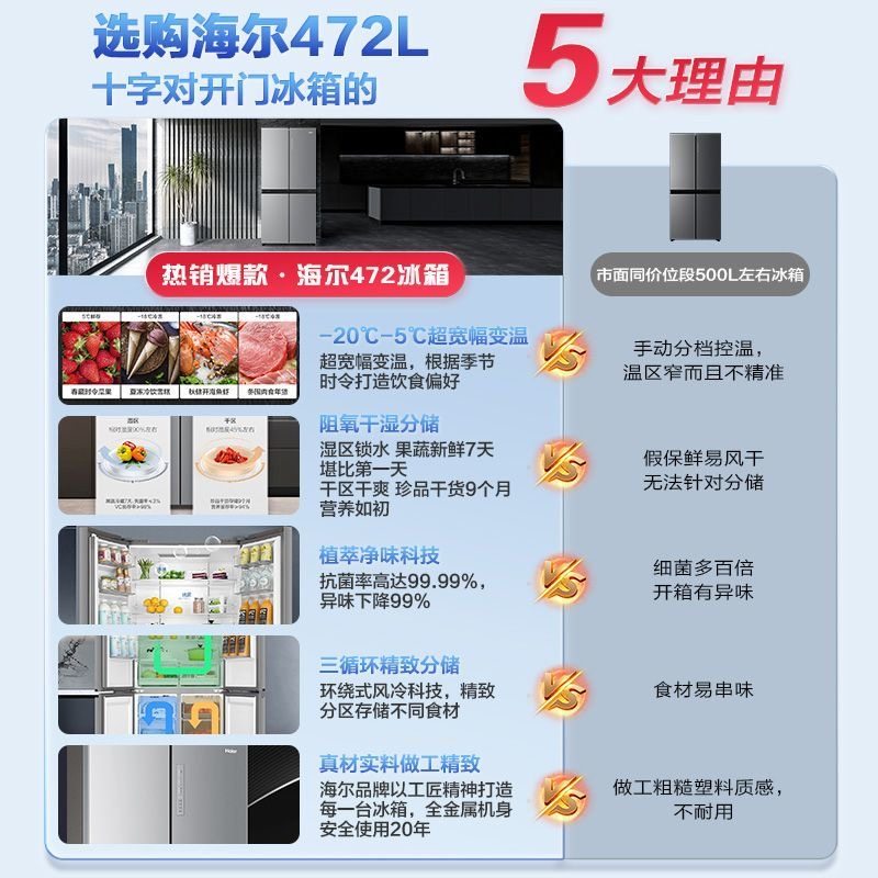 📚 25新款海尔冰箱472L双开四门一级超薄风冷无霜双变频冷冻干湿分储
