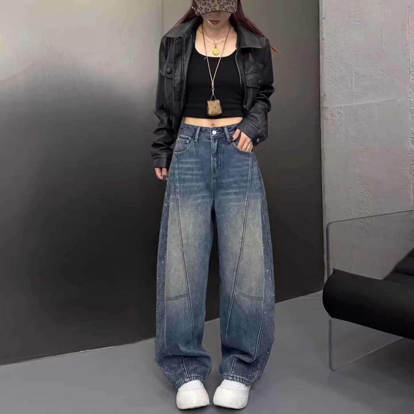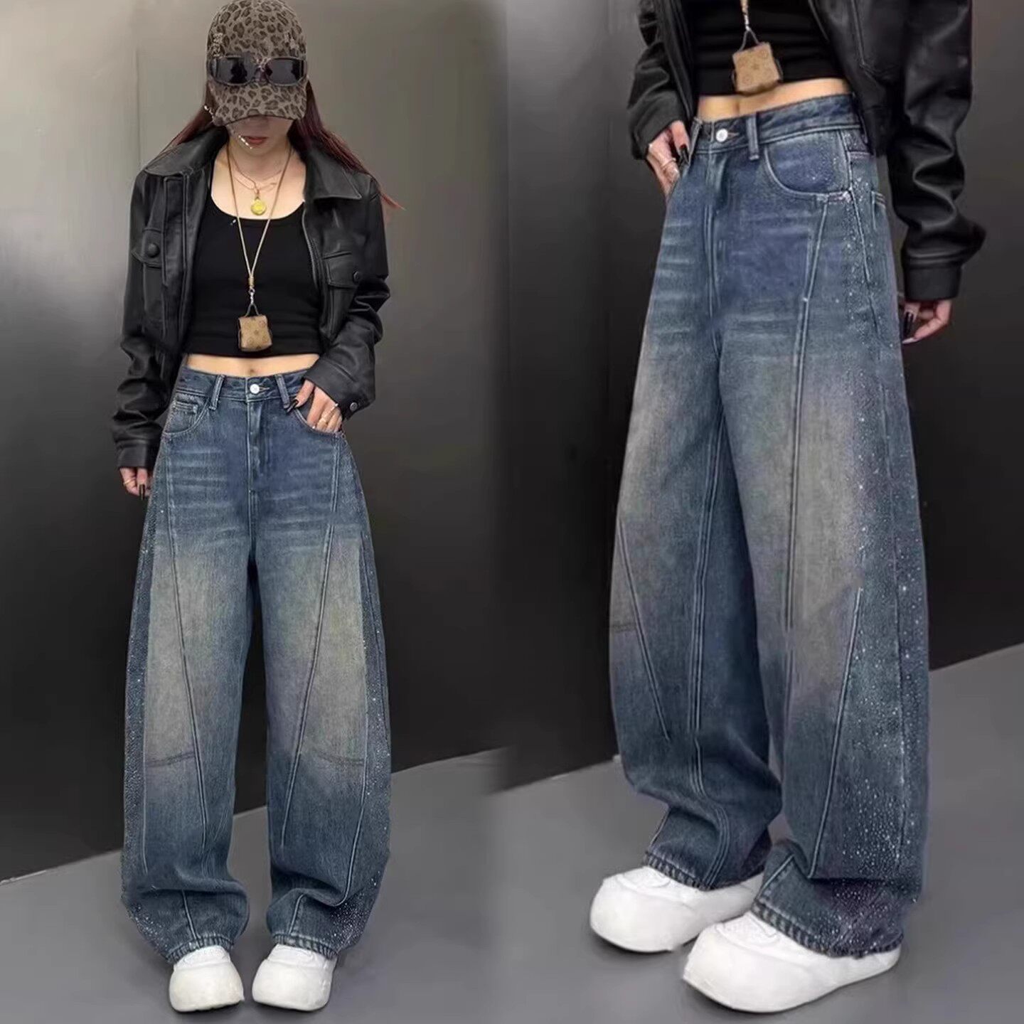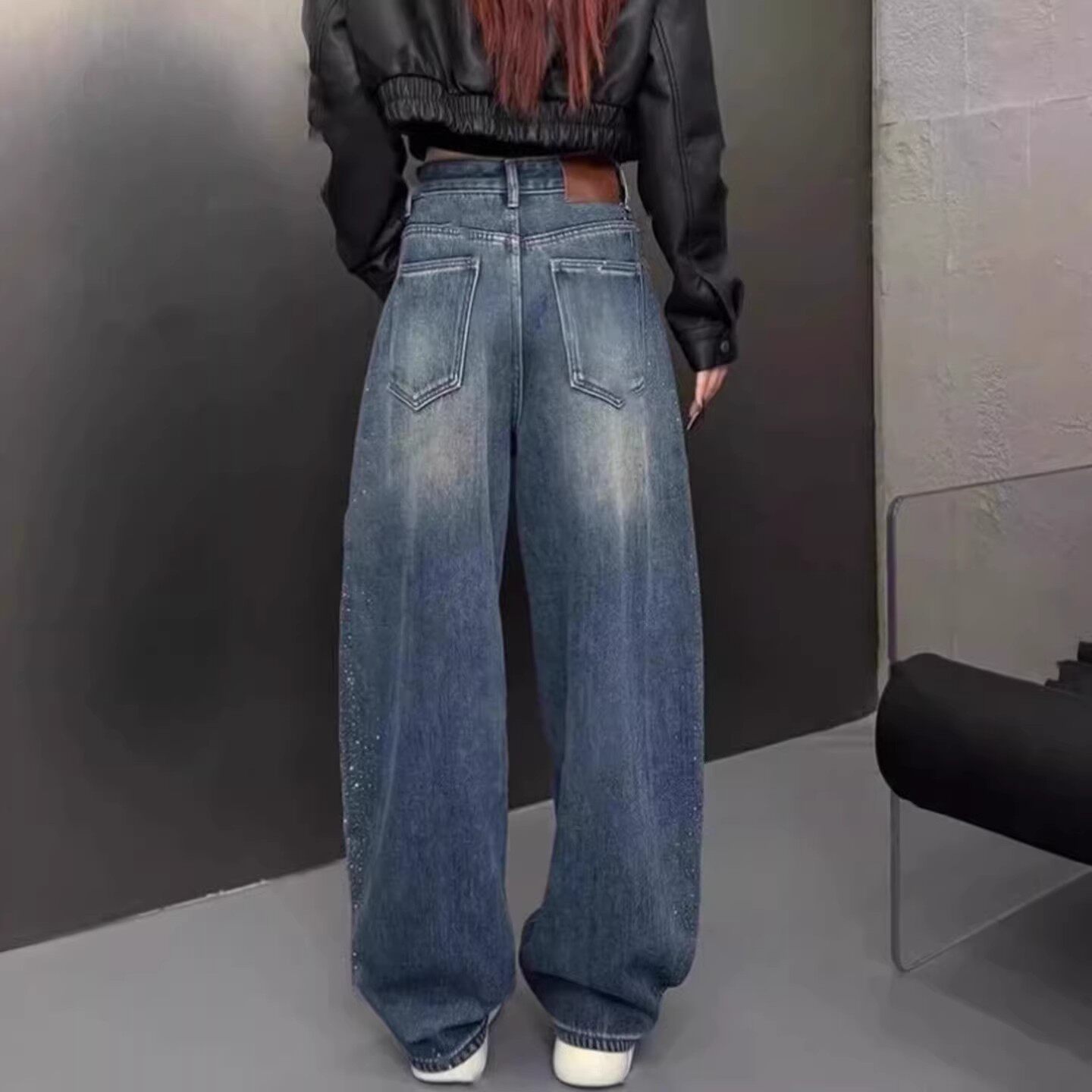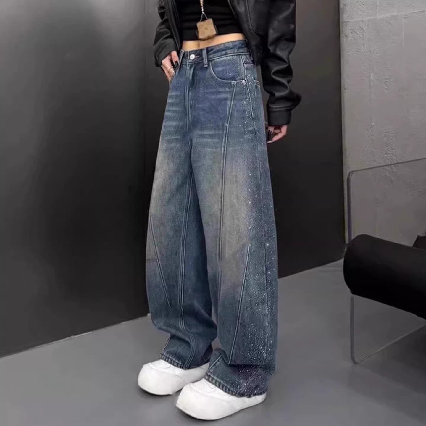 📚 复古轻奢高级感烫钻加绒弯刀牛仔裤女2026春季新款美式宽松阔腿裤