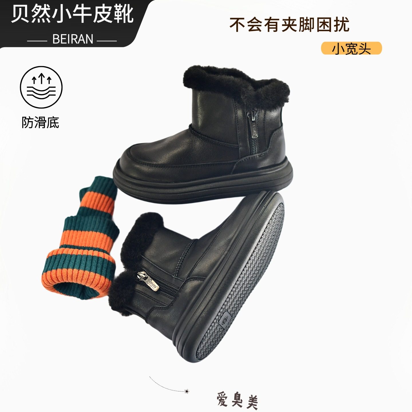 📚 贝然冬季新款加厚雪地靴保暖棉鞋厚底防滑短筒面包鞋真皮牛皮里软