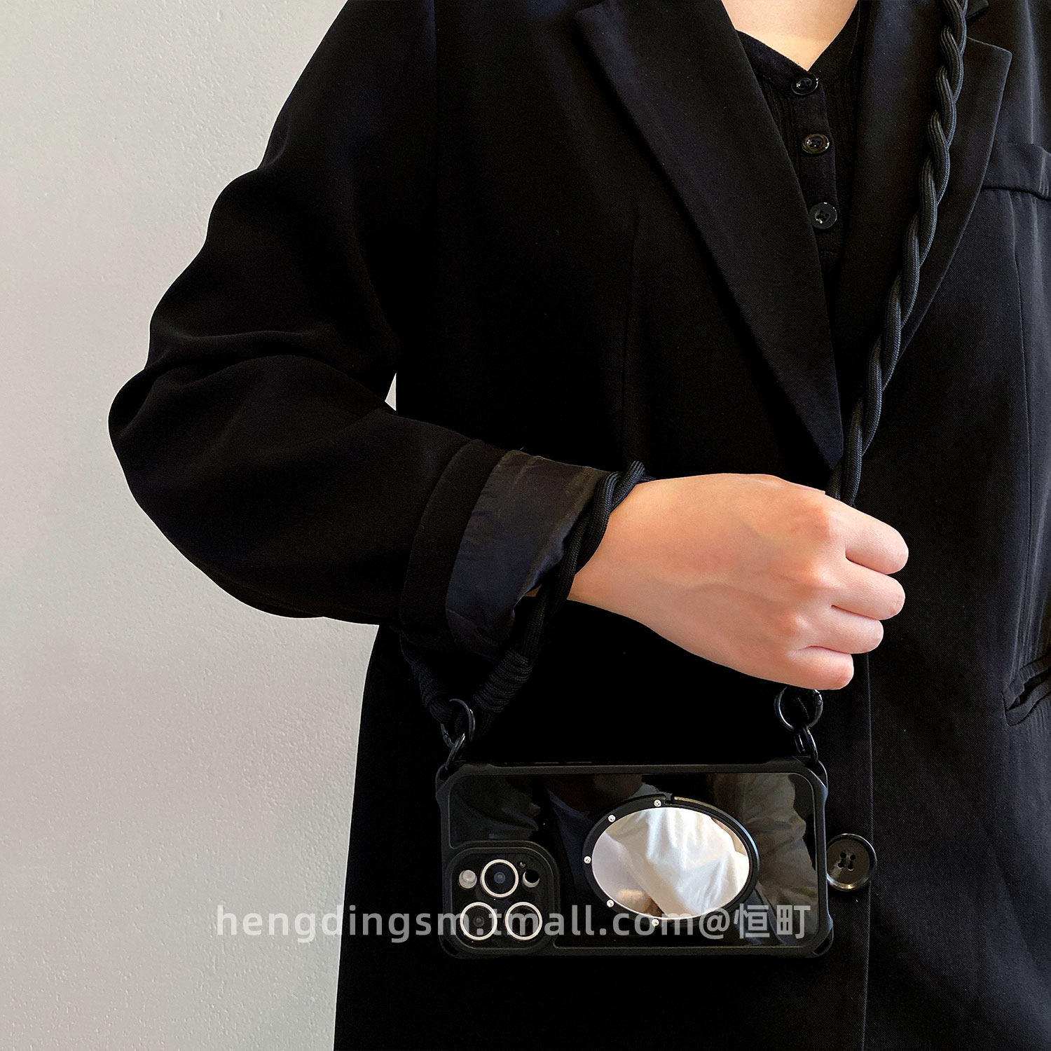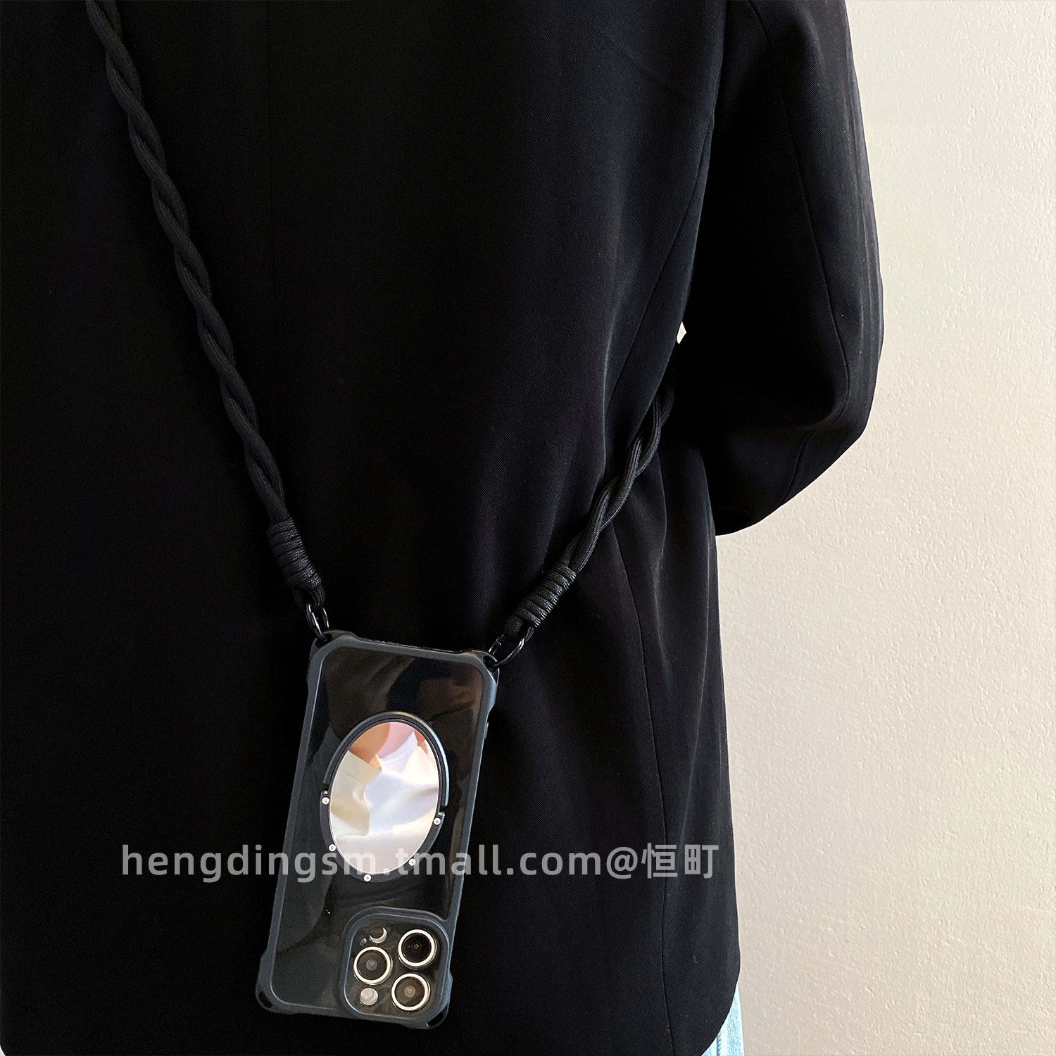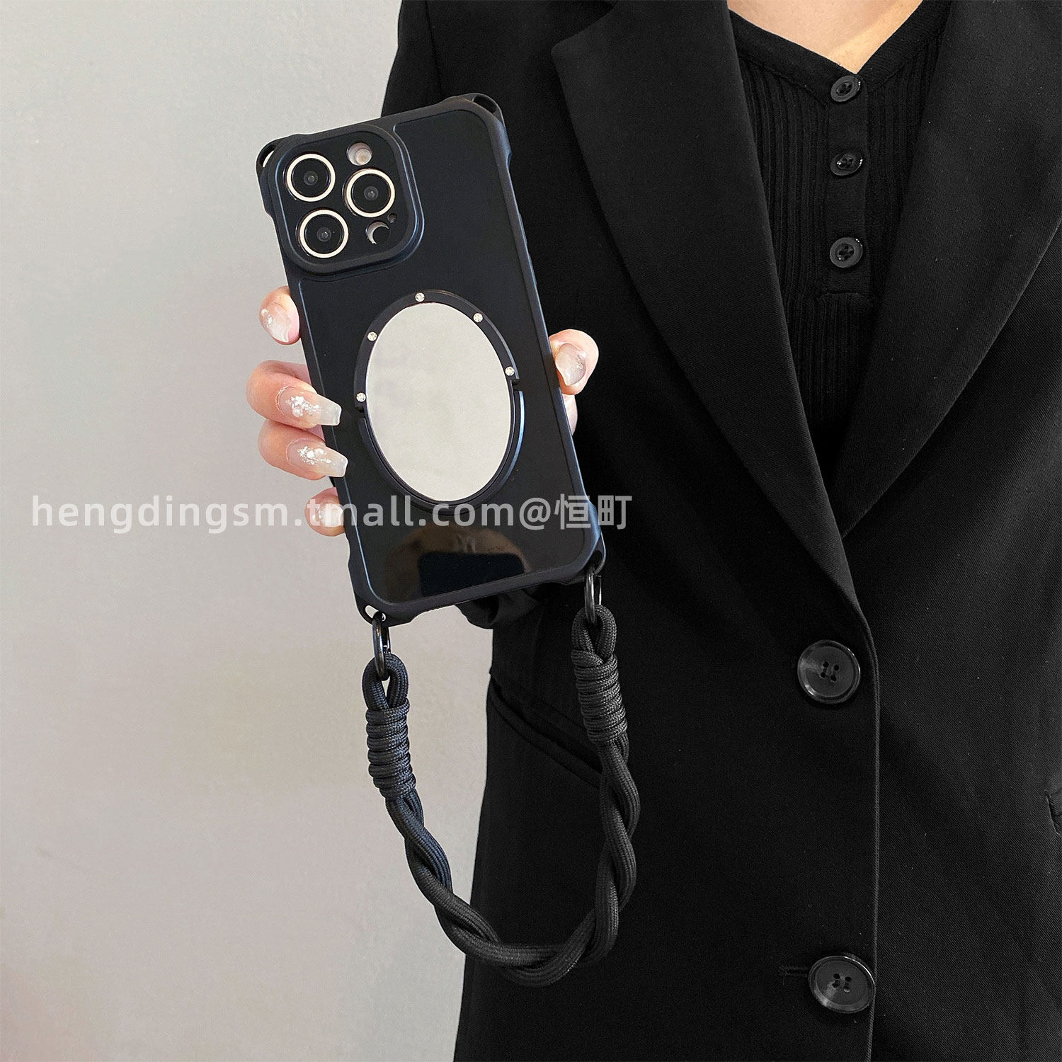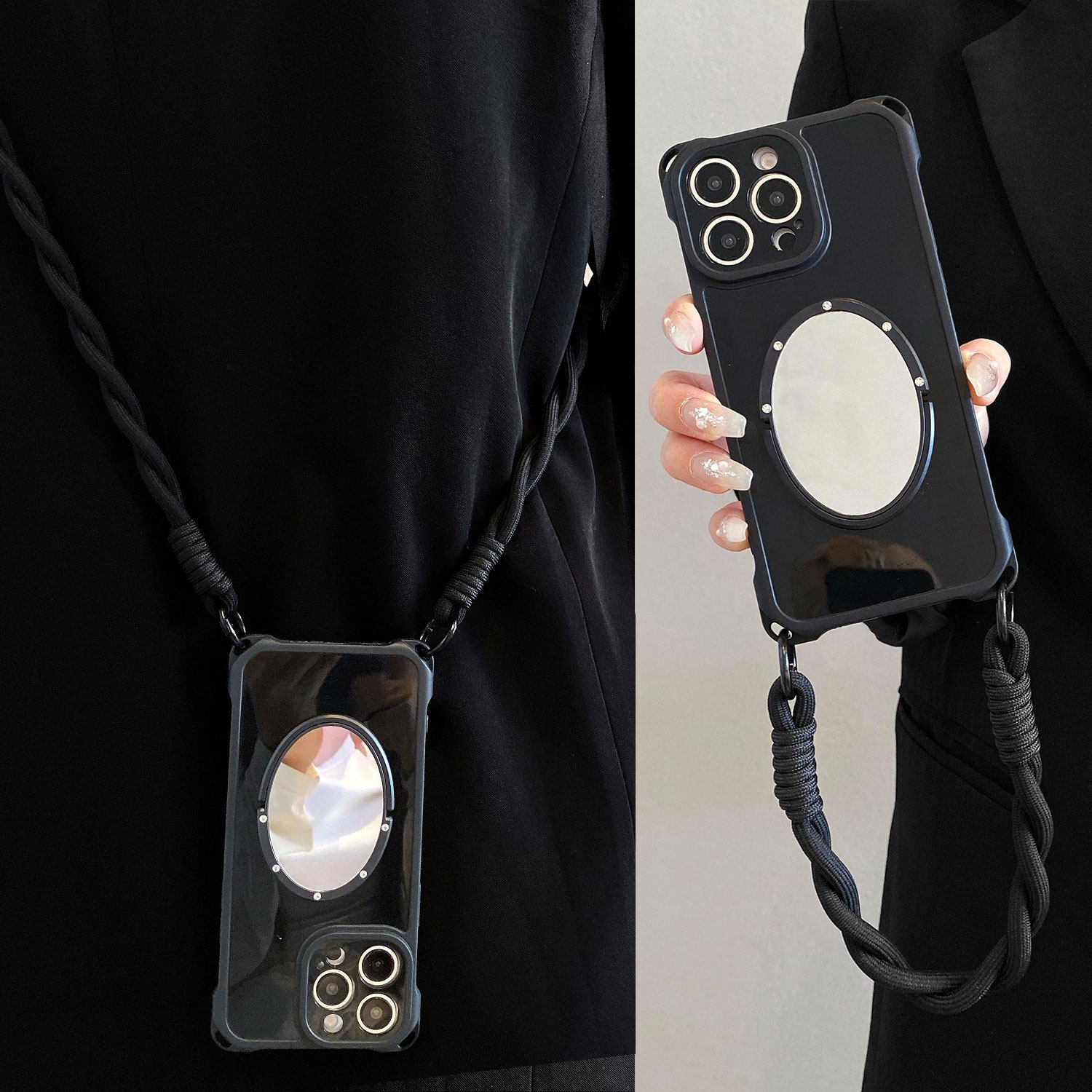 📚 质感黑镜子支架适用苹果17手机壳iPhone16promax四角可挂15pro可背斜挎14防摔13手拎绳xsmax补妆12软11女x/7p