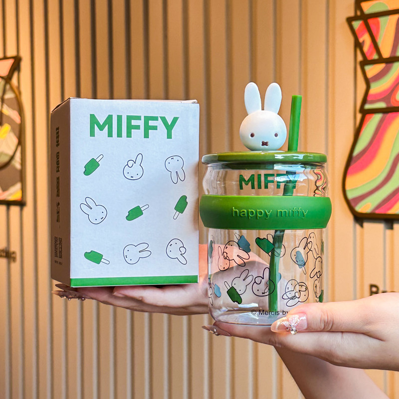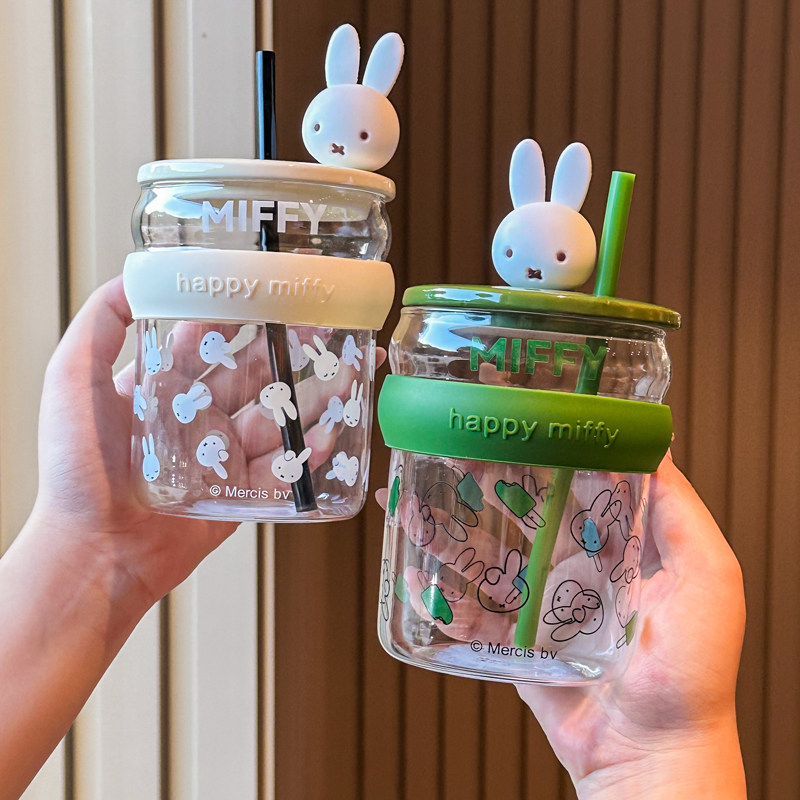 📚 米菲兔吸管杯家用高硼硅玻璃杯可爱女生喝水杯耐高温果汁杯伴手礼