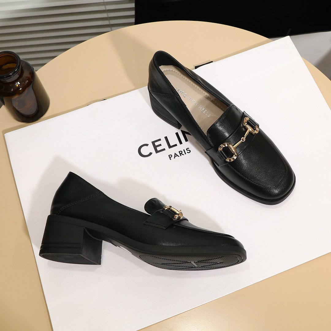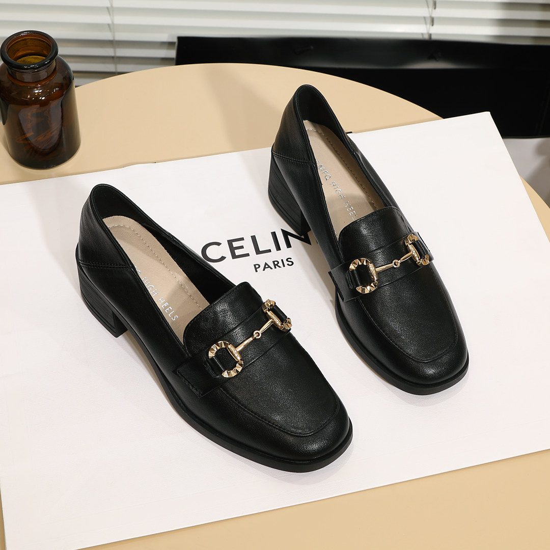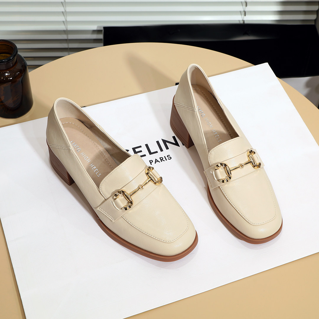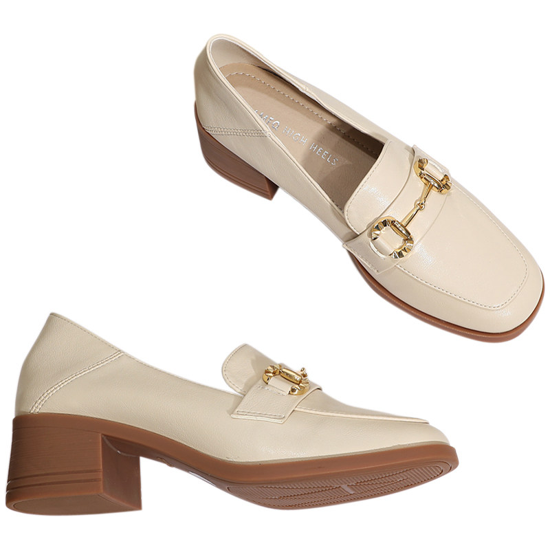 📚 舒适牛筋底小皮鞋女英伦风复古金属扣粗跟米白色中跟软皮方头单鞋