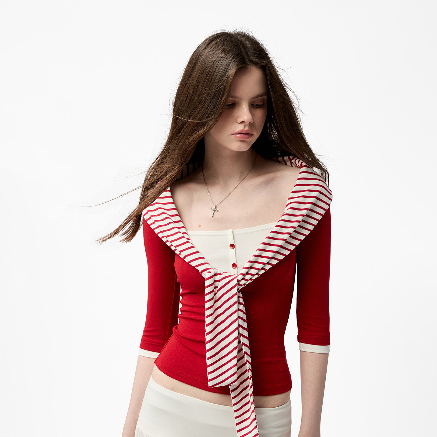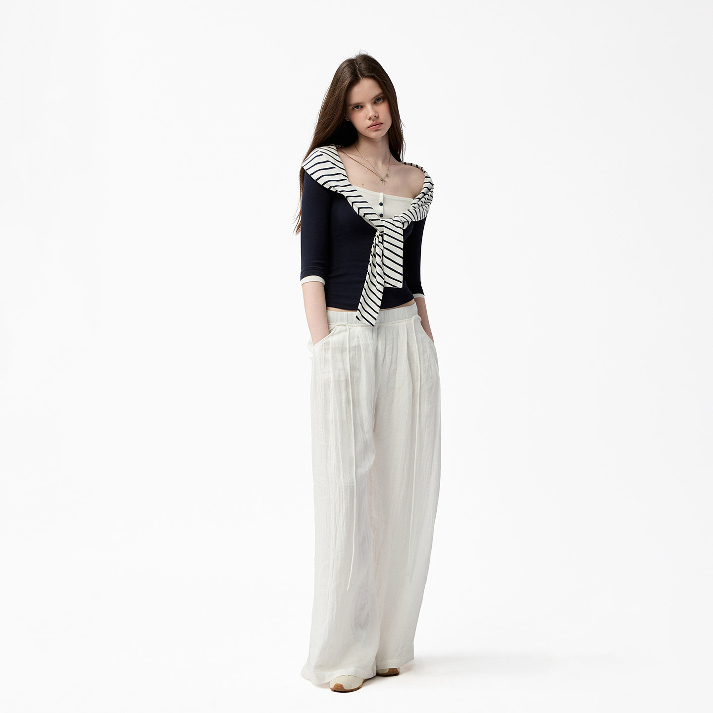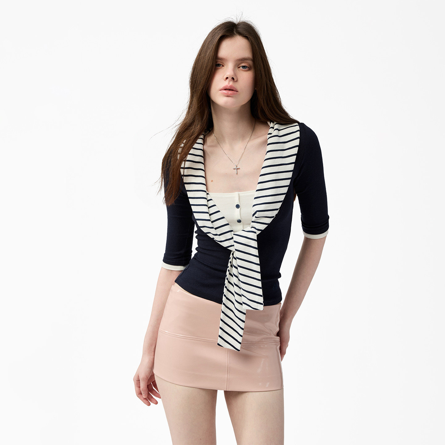 📚 4muggle海军风亨利领假两件七分袖上衣条纹打结针织慵懒打底女