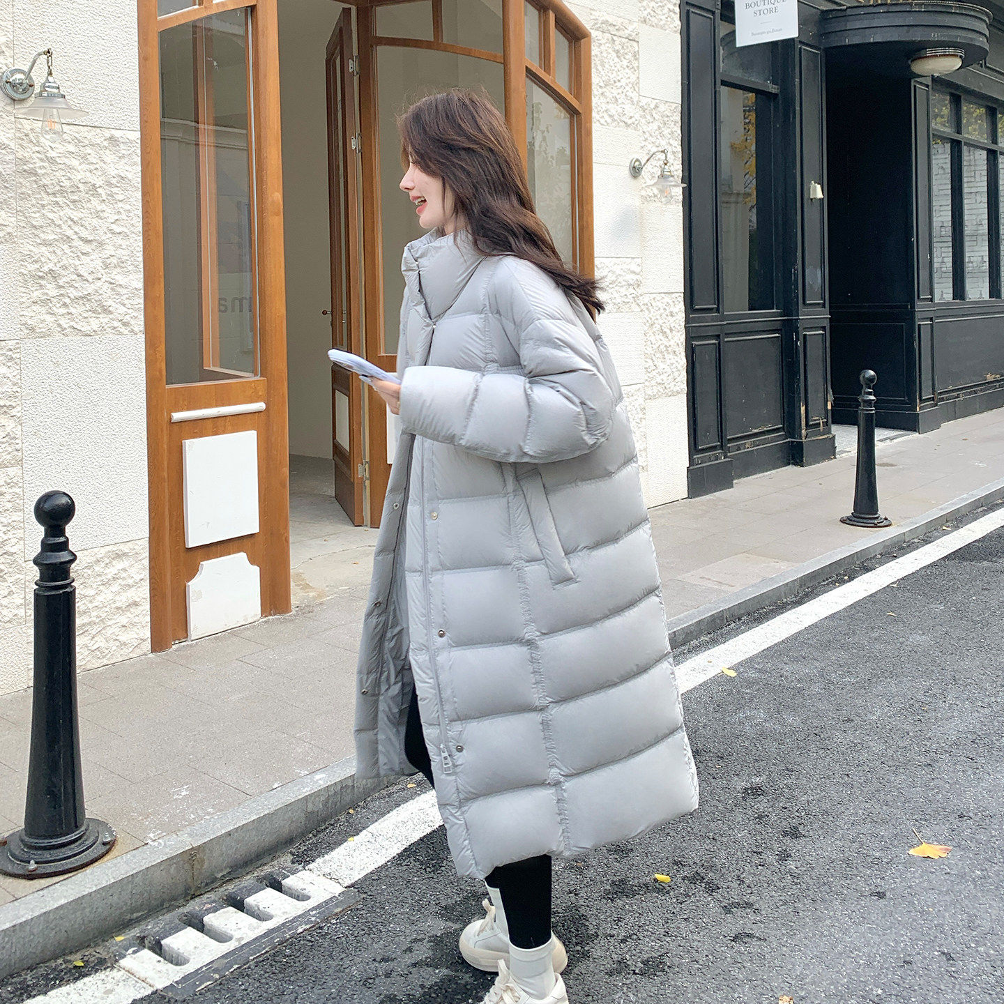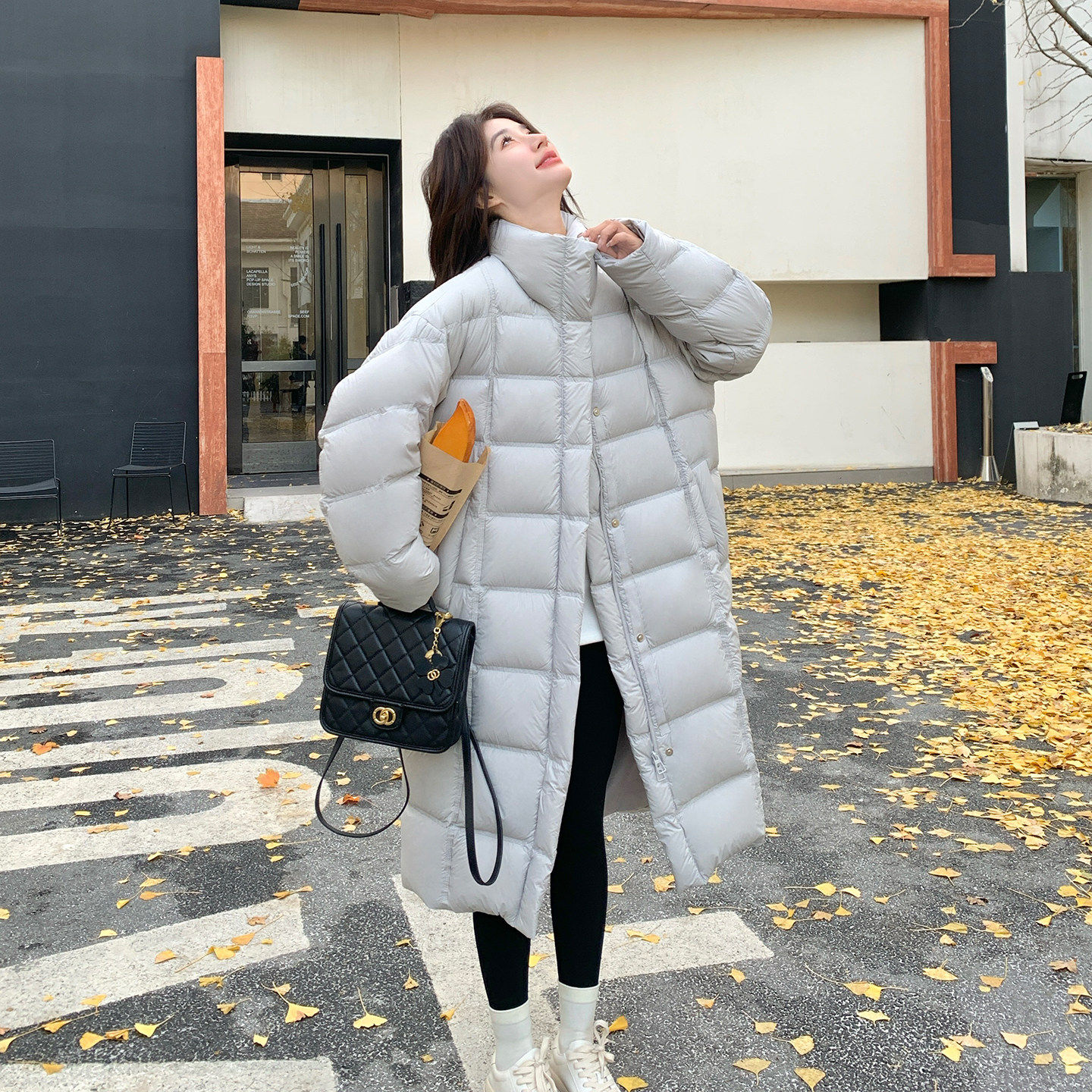 📚 灰白色中长款立领泡芙感羽绒服女2025冬韩系宽松保暖90白鸭绒外套