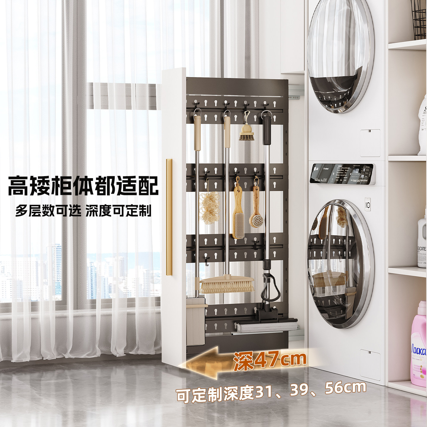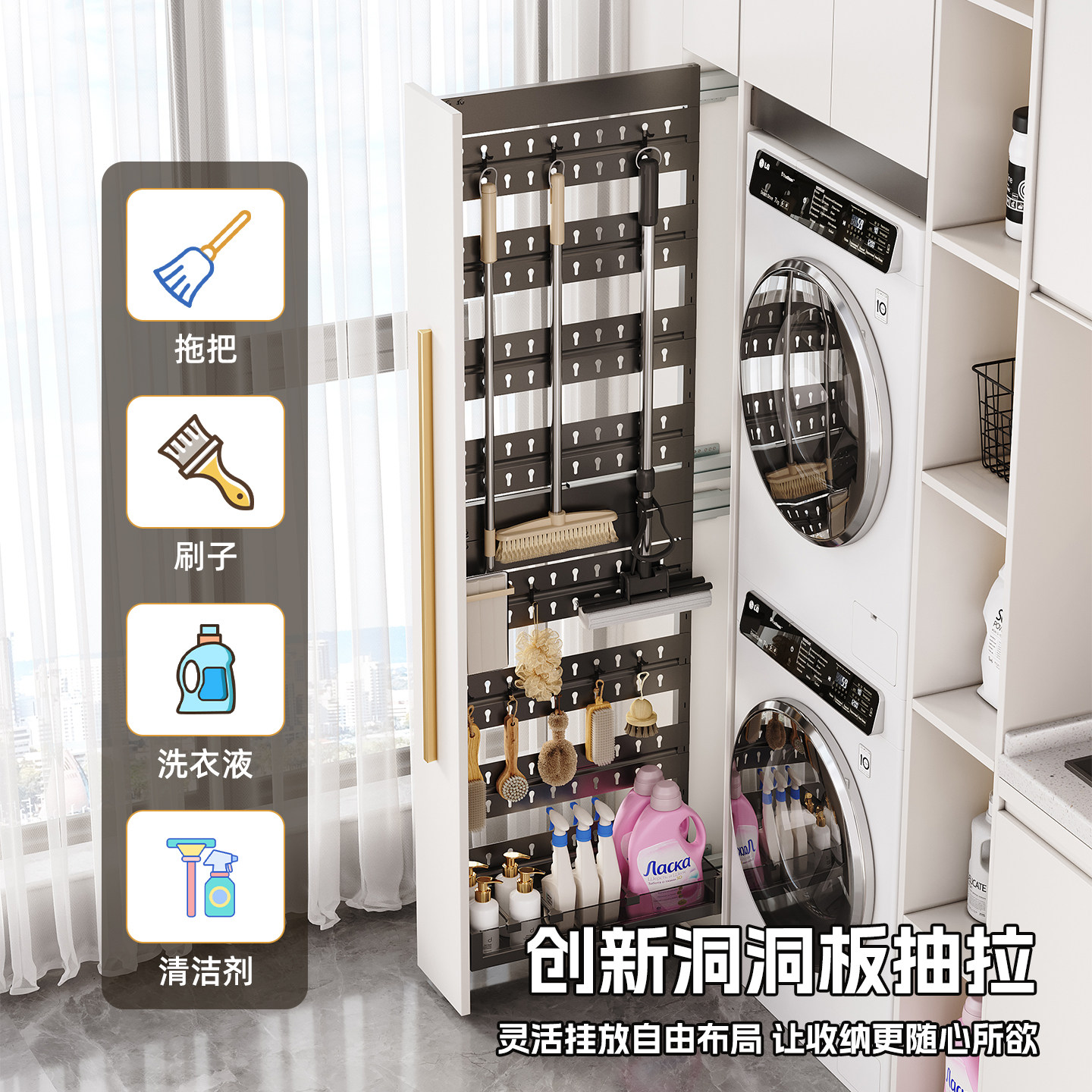 📚 阳台抽拉式洞洞板置物架推拉夹缝高柜侧装拉篮改造清洁工具收纳架