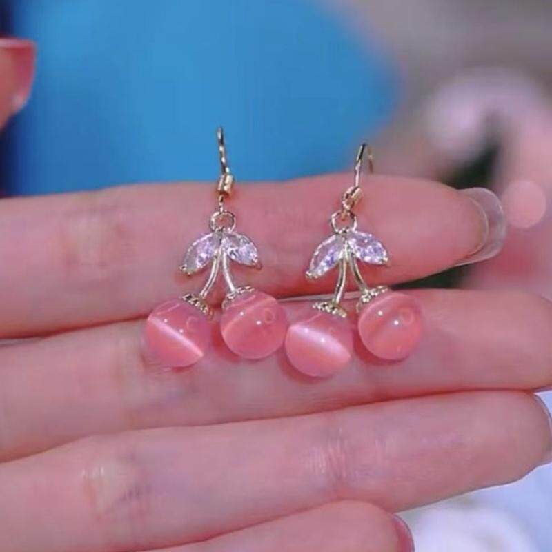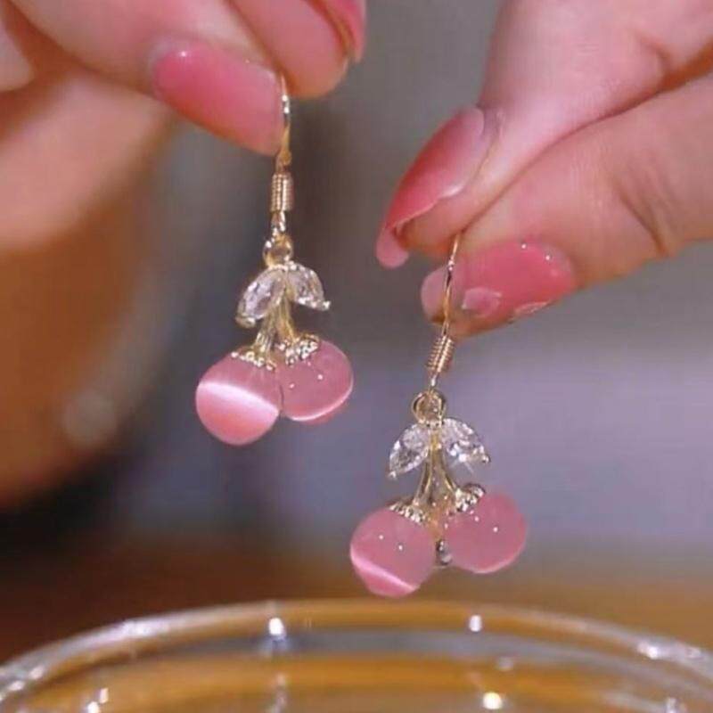 📚 小巧精致甜美樱桃耳环女时尚简约粉色猫眼石灵动耳饰挂钩爆款小众