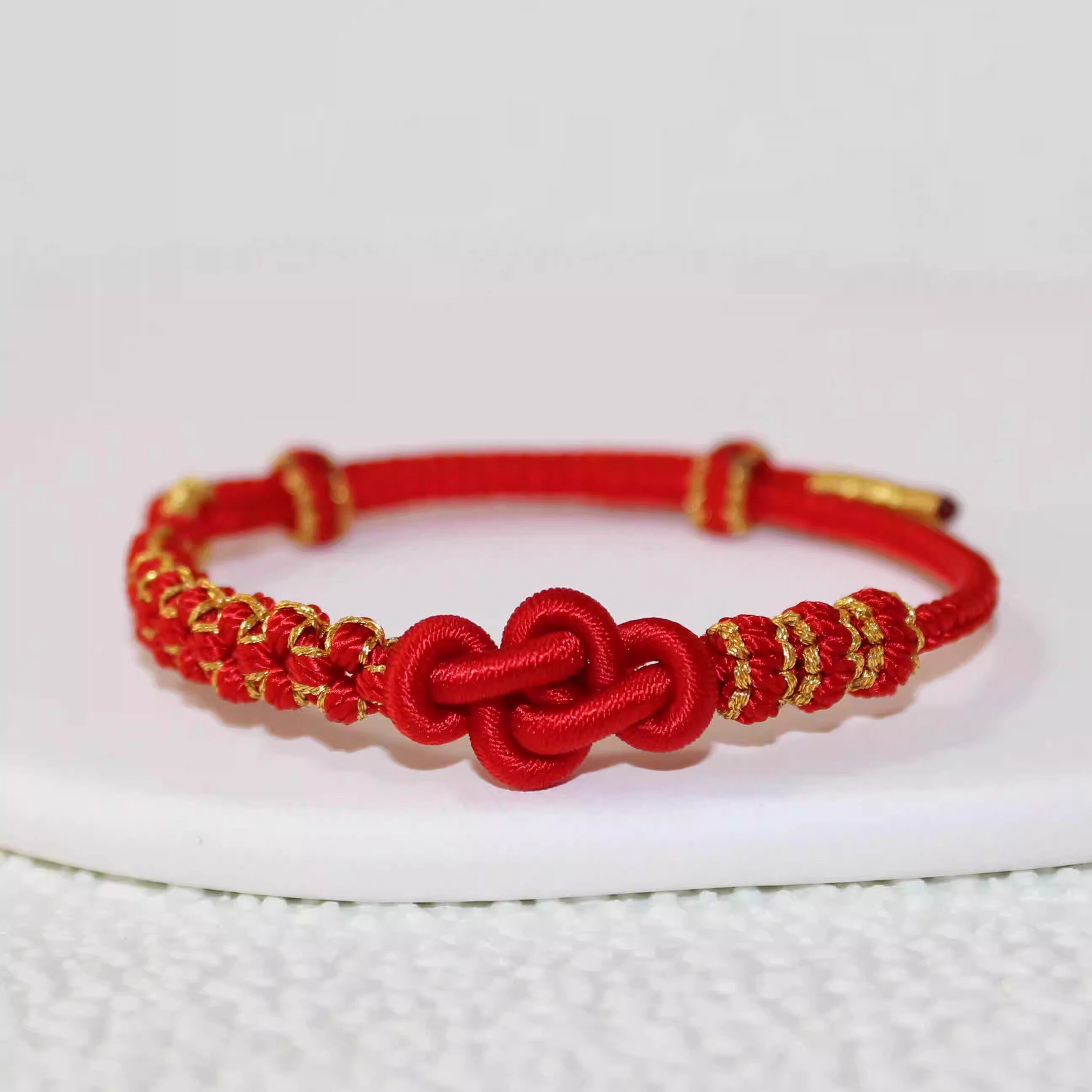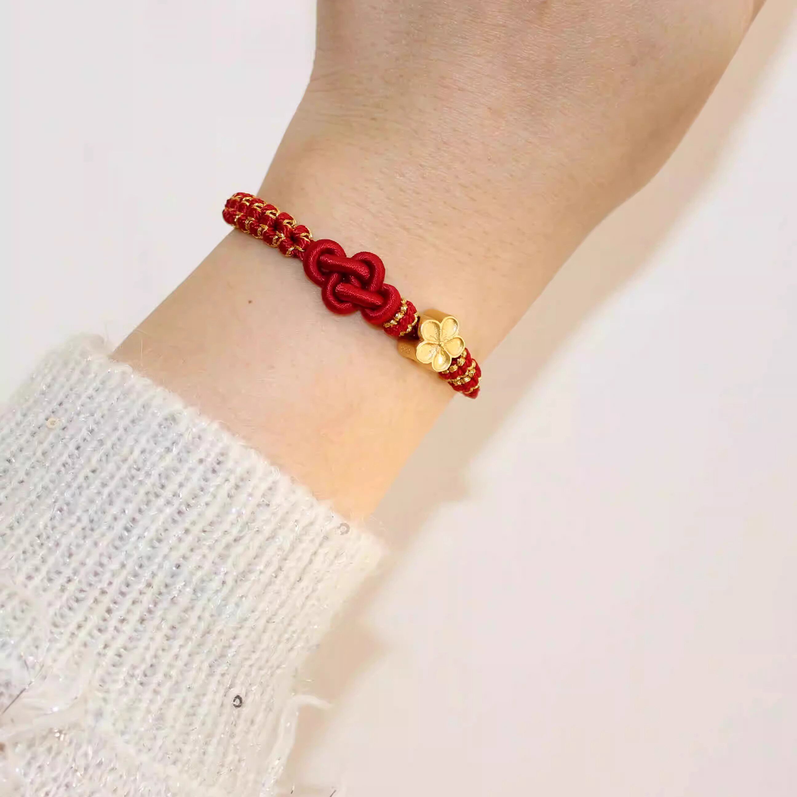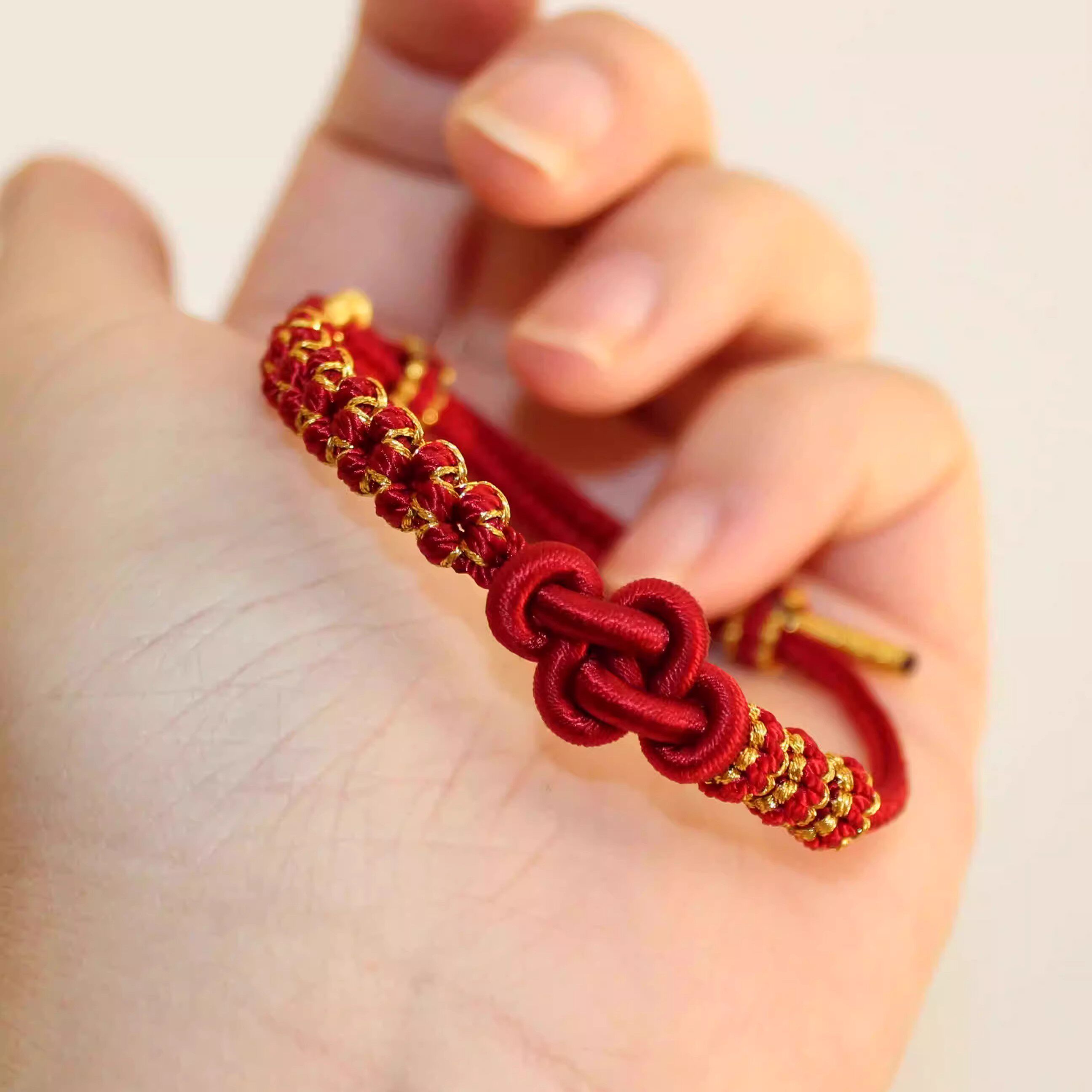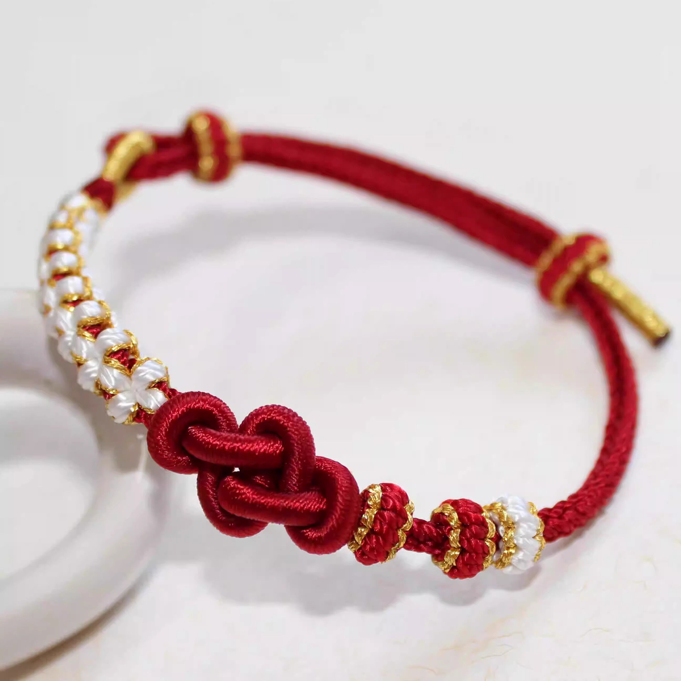 📚 桃花如意结手绳可穿3D硬金通孔珠女小红书手工DIY红绳手链半成品