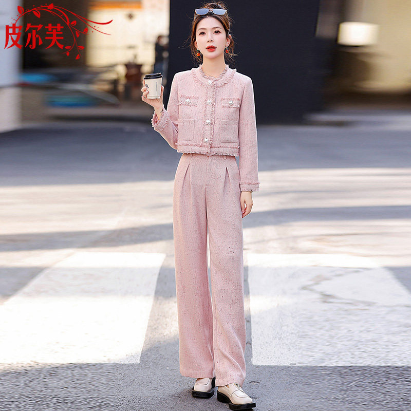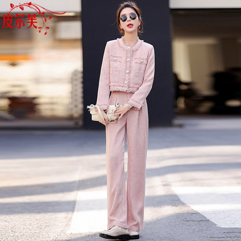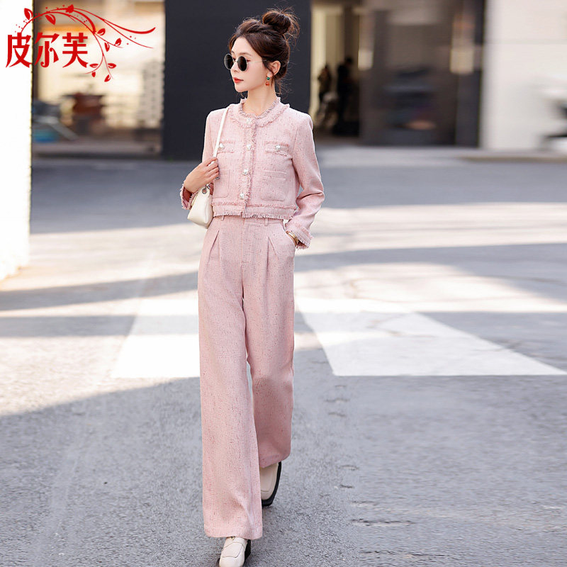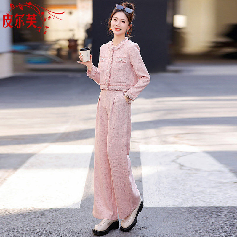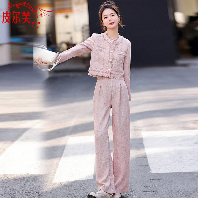 📚 粉色小香风搭配套装女小个子2026春秋季新款气质显瘦阔腿裤两件套