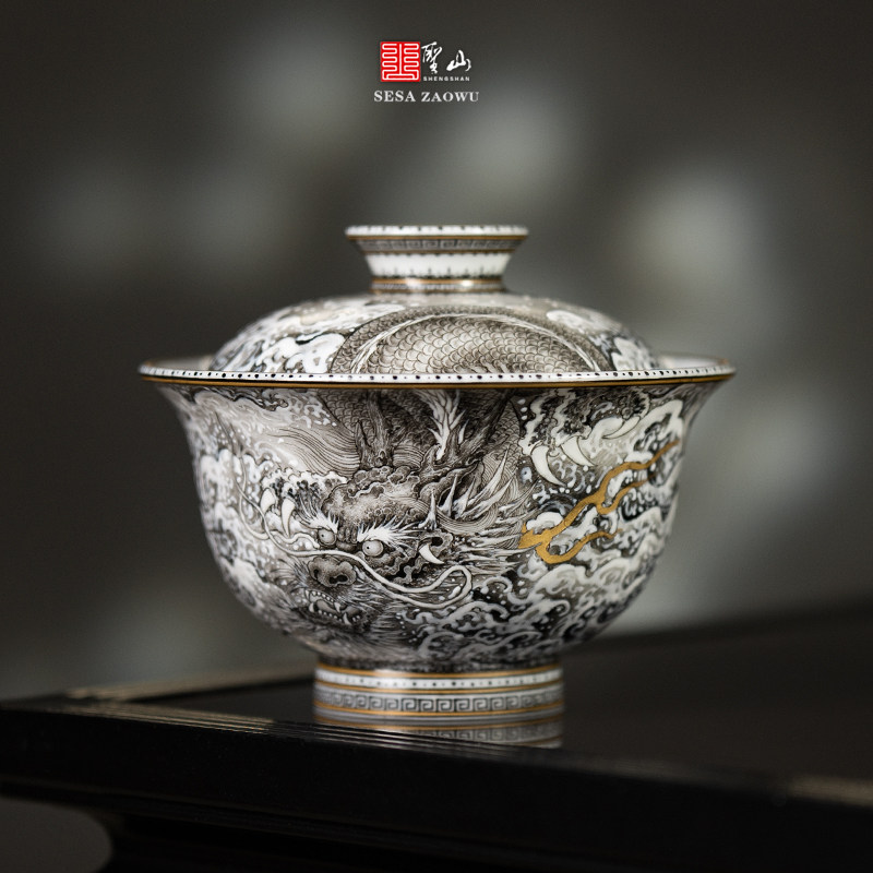 📚 圣山高端粉彩茶具景德镇手工手绘粉彩墨龙盖碗茶杯泡茶盖碗