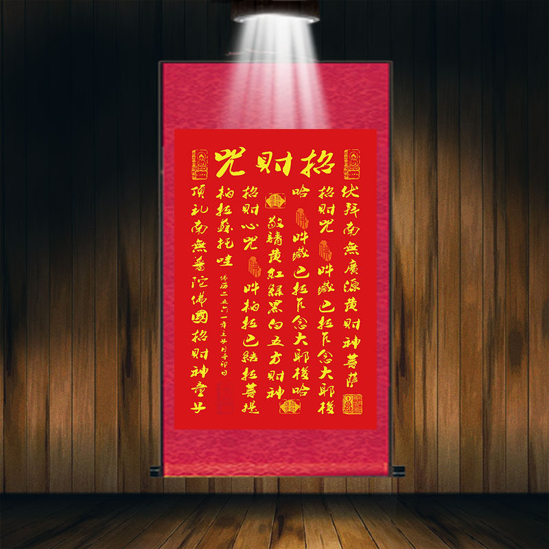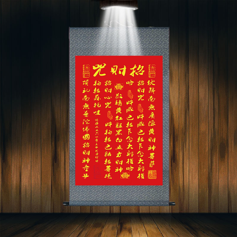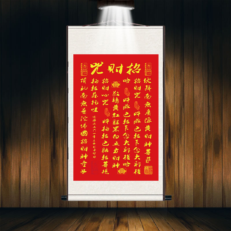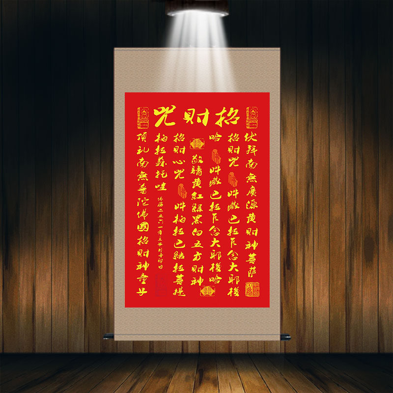📚 黄财神招财心咒客厅玄关风水招财进宝五方财神丝绸卷轴装饰挂画