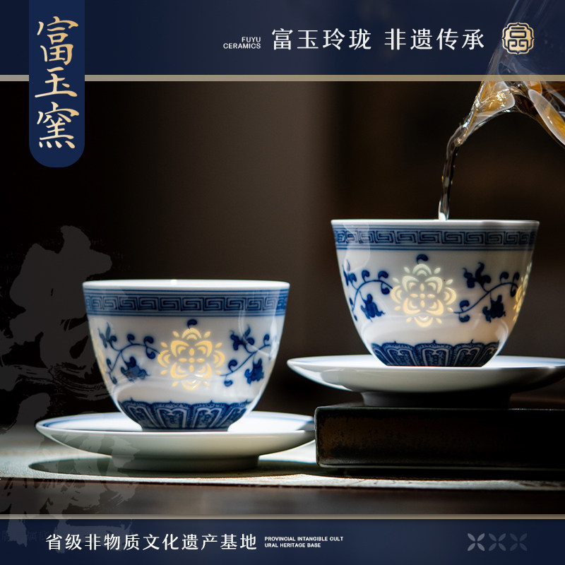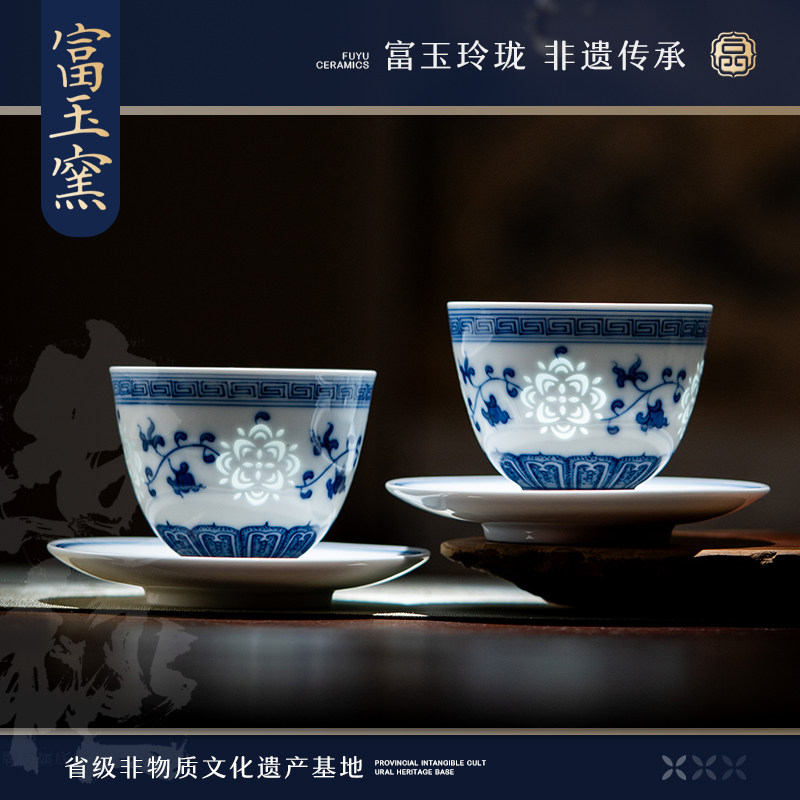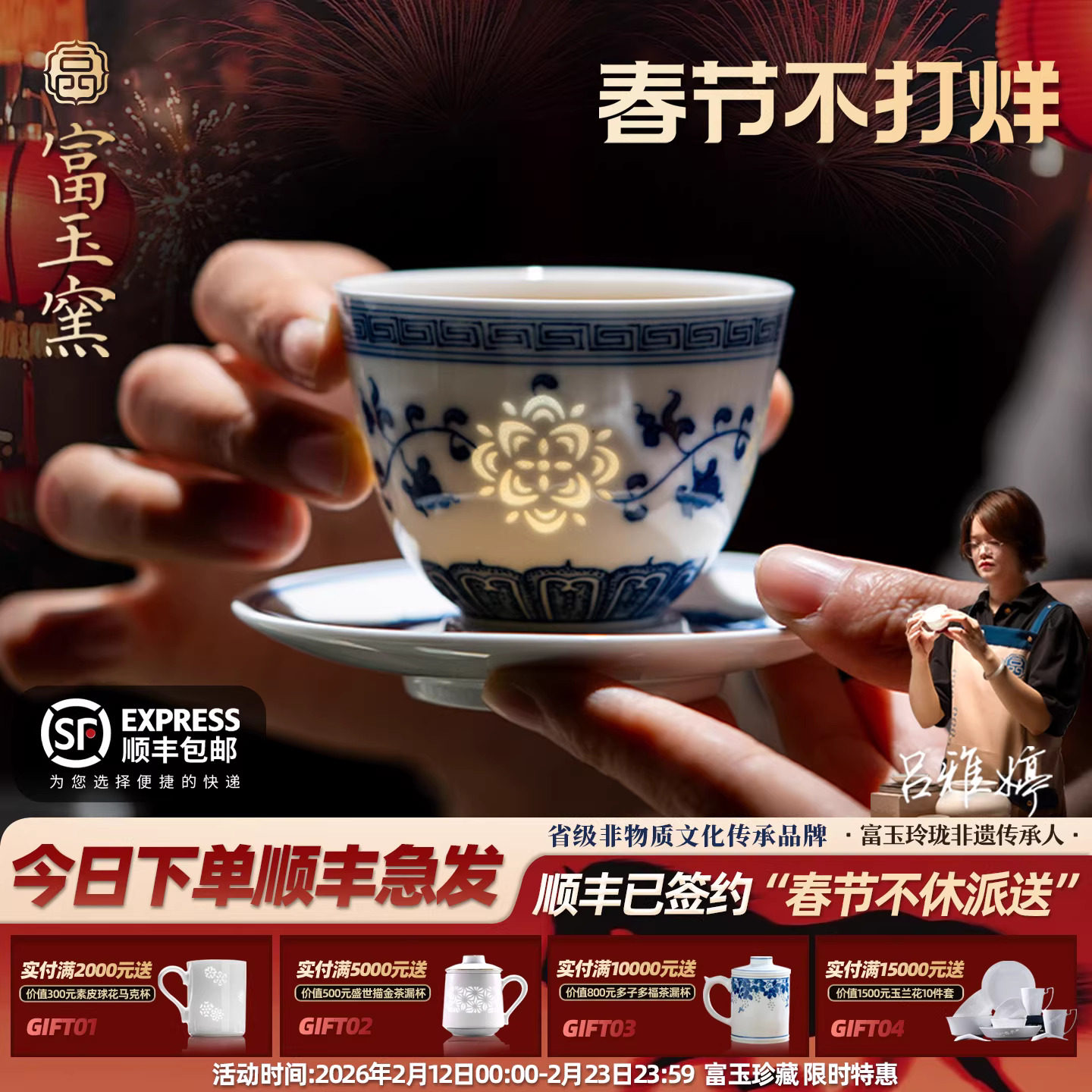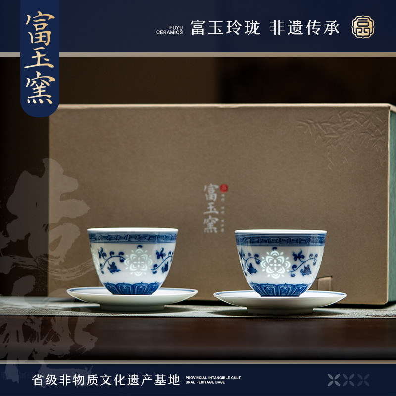 📚 富玉窑官方旗舰店景德镇主人杯一对情侣对杯手绘青花玲珑功夫茶杯