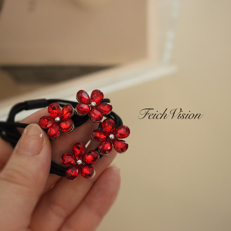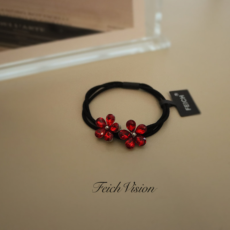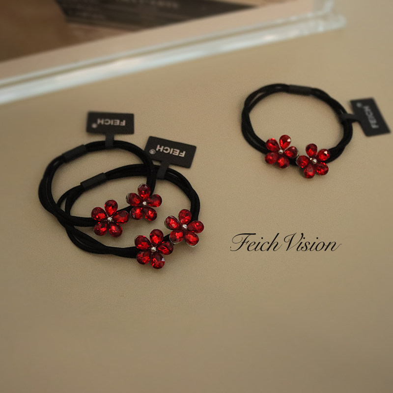 📚 FEICH幸运绯红花朵水晶发圈 甜美可爱国风弹力皮筋马尾头绳发饰品