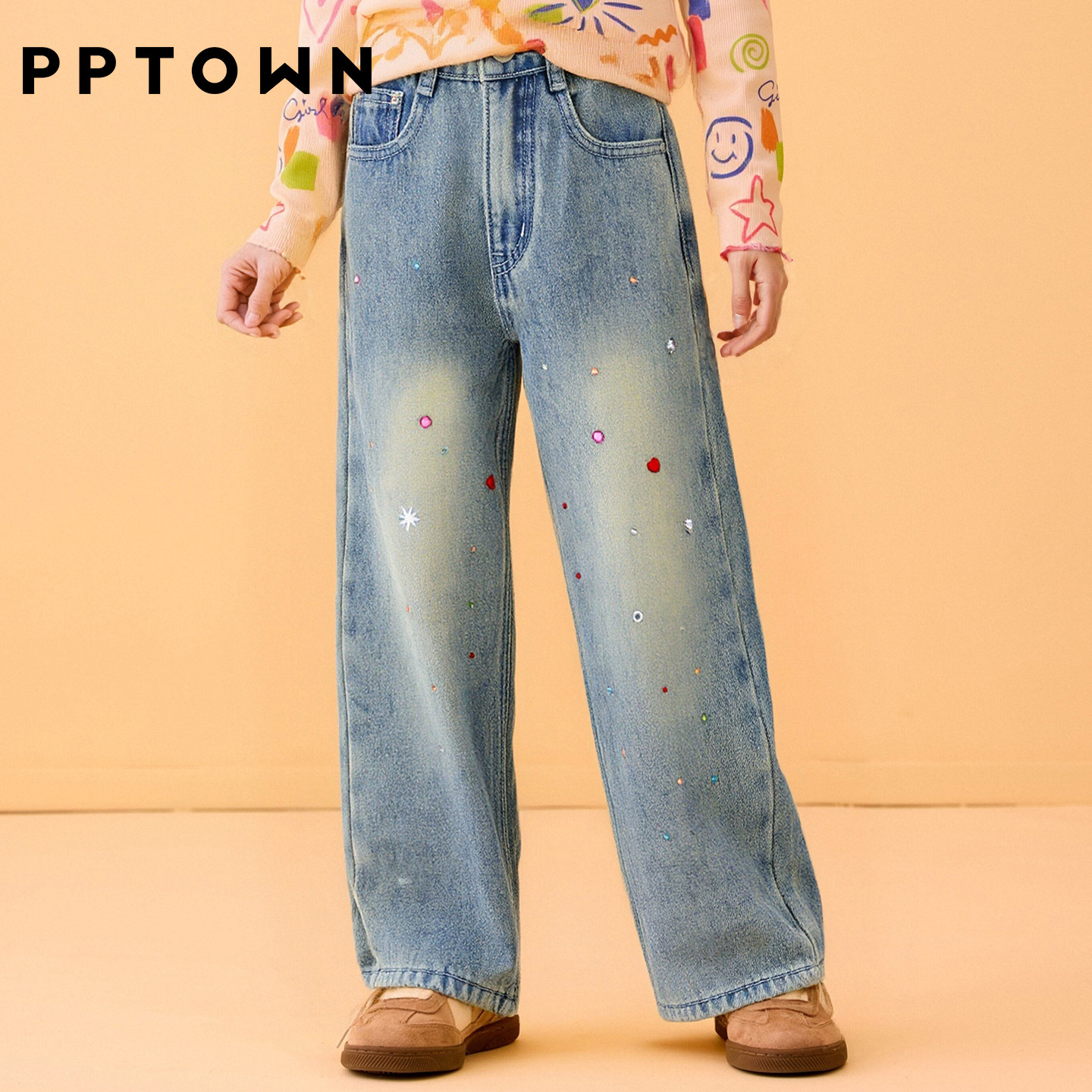 📚 女童牛仔裤秋冬女大童阔腿裤冬天加绒加厚保暖裤子钻设计感直筒裤