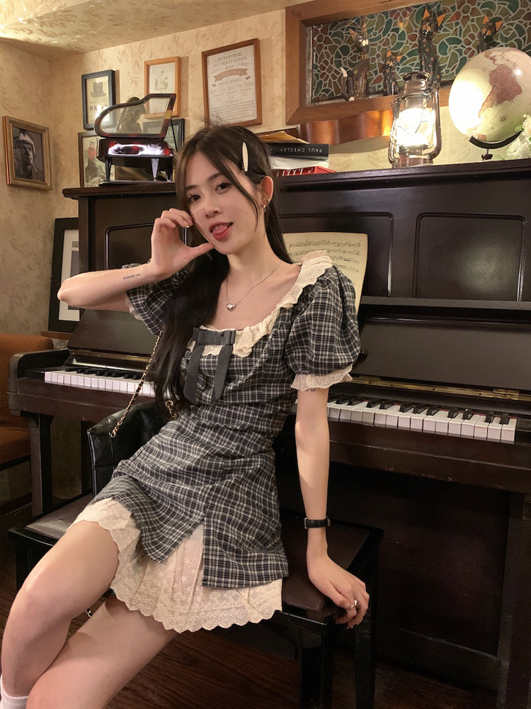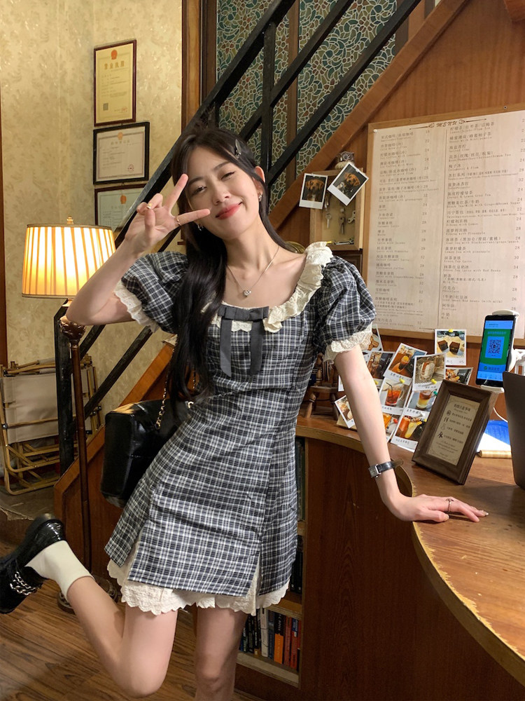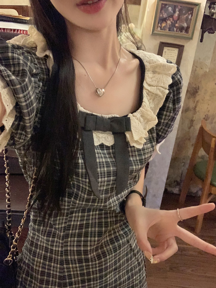 📚 最小的海 甜美学院风短袖连衣裙2024夏季新款格纹拼接花边短裙女