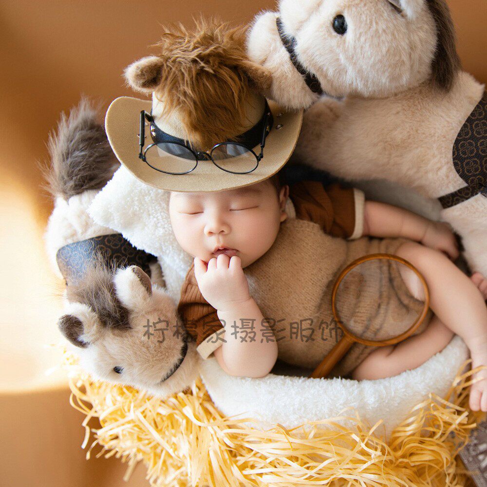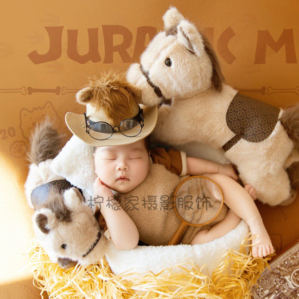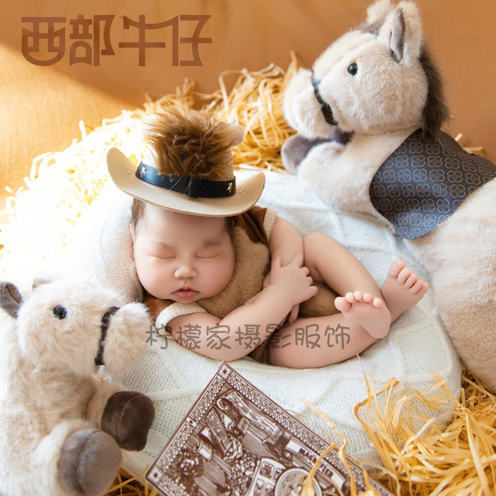📚 马年西部牛仔主题服装新生儿满月宝宝咖色背带套装影楼复古写真