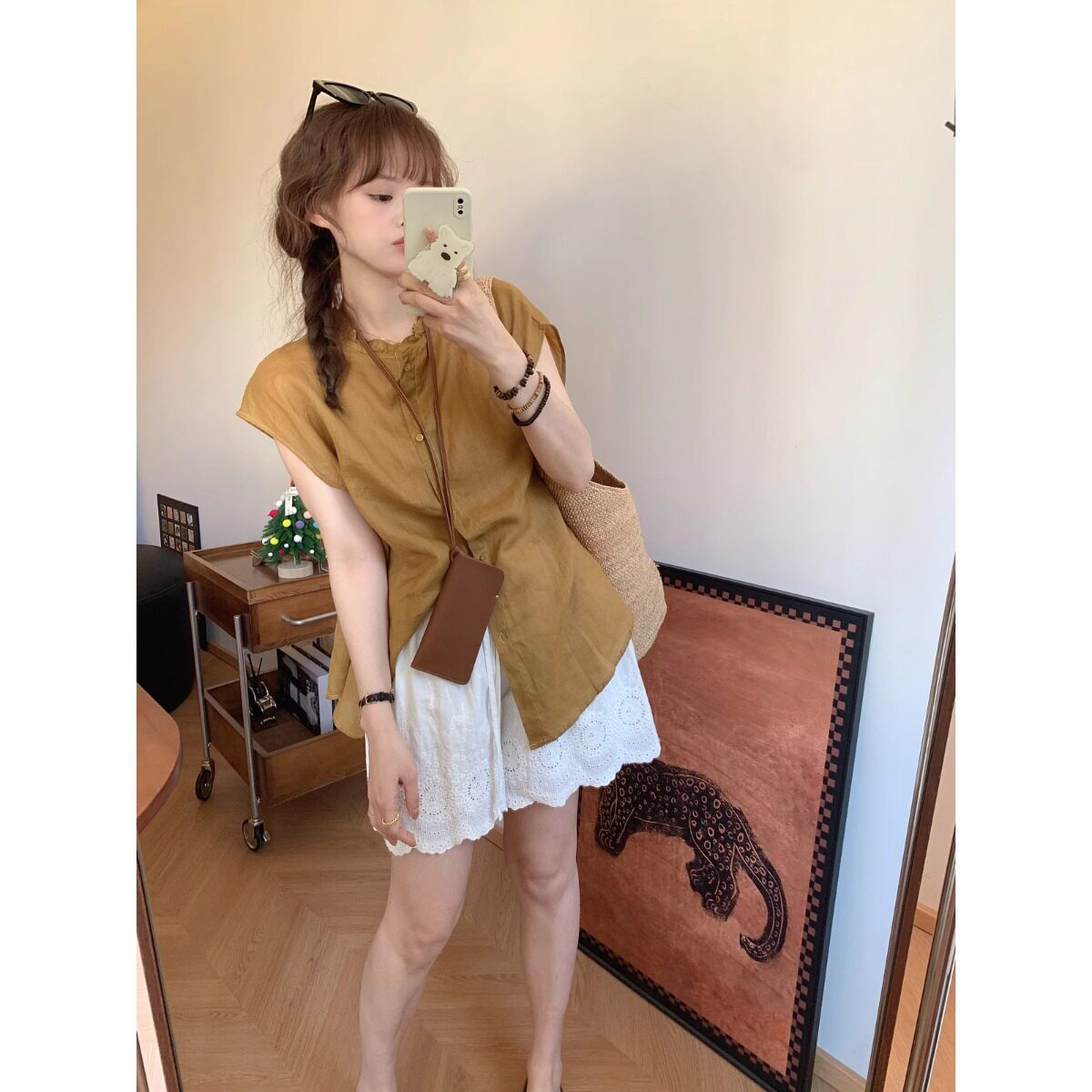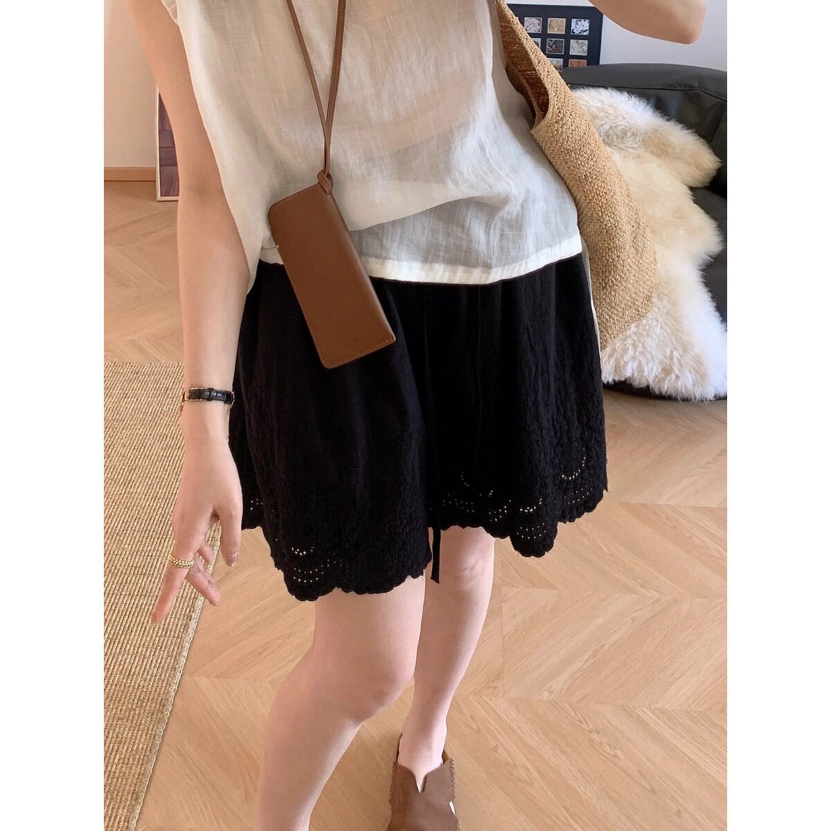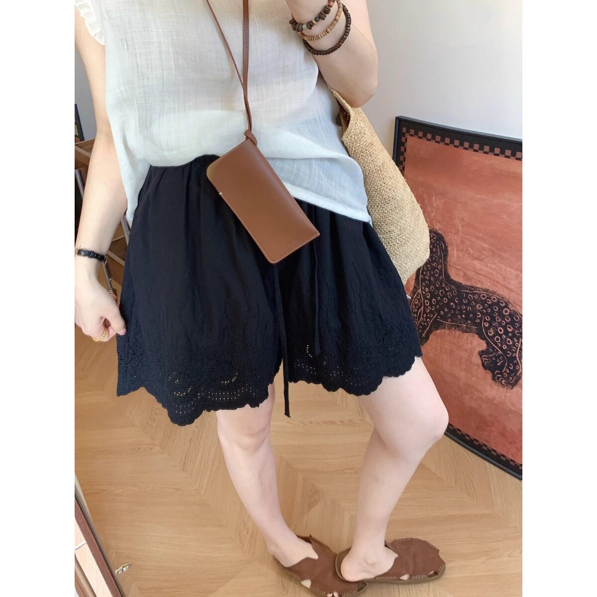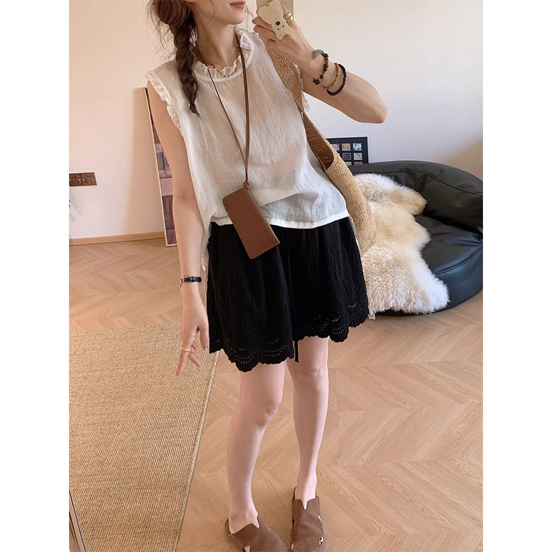 📚 夏季新款镂空绣花短裤阔腿裤日系简约刺绣花边短裤女士外穿三分裤