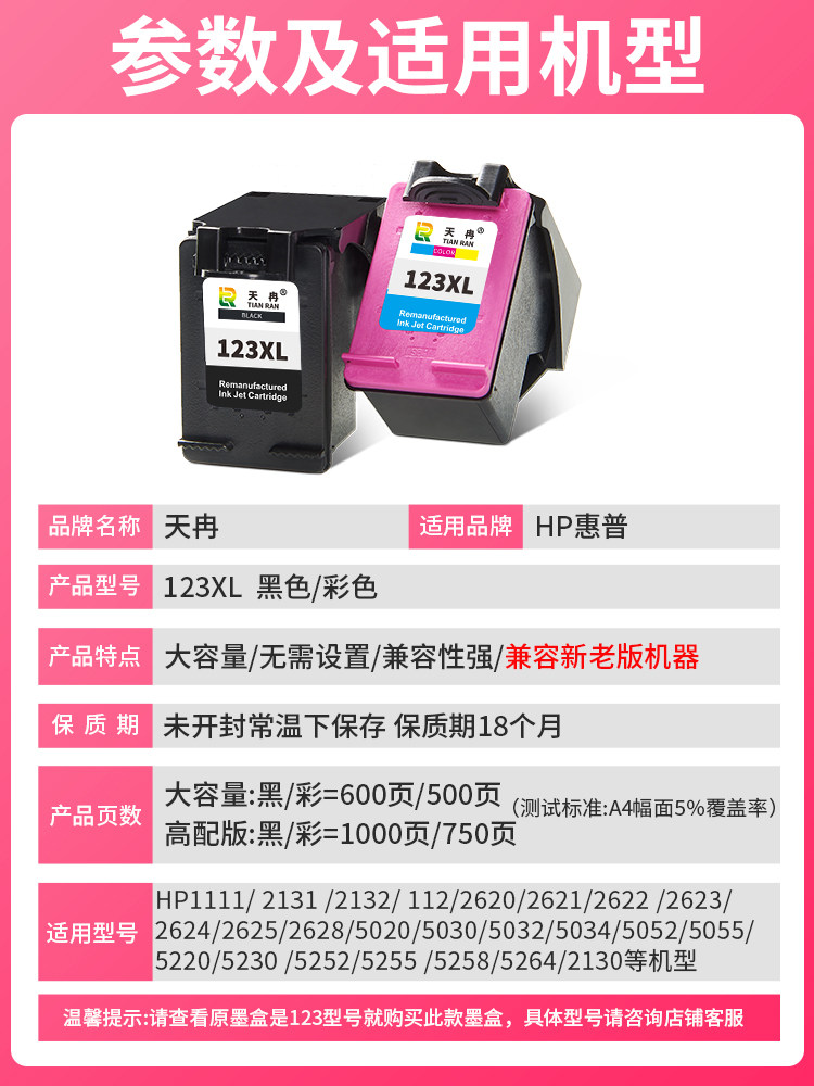 📚 天冉兼容惠普HP123XL墨盒DeskJet2130 2620 2630 2632 2633 2652 5020 5030 5032 5055 5220打印机墨盒黑彩色